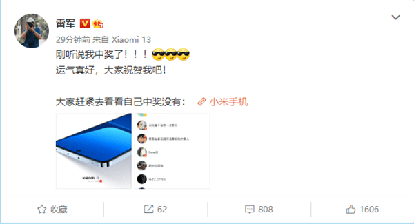 运气爆棚了,雷军在小米手机的官方抽奖活动中,抽了一台小米13! 12月8日,小米手机官微推出抽奖活动,转发微博抽送100台小米13。今晚小米13系列发布会后,抽奖结果出炉,雷军赫然在列。 雷军中奖后也发文称自己运气真好:“刚听说我中奖了!!![酷][酷][酷]运气真好,大家祝贺我吧!” 看到这一结果,网友纷纷调侃: 再抽一次吧,雷总中了,严重怀疑有内幕 没想到有一天要来吸雷军的欧气 过分了啊[泪] 我没中,军哥你能把你中的给我么 当然,雷军本来就是小米手机账号的铁粉,参与合情合理,中奖也只能说运气太好,地球上最不缺小米的人中了一台小米13,找谁说理去。 抽奖结果还显示,该抽奖由微博官方唯一抽奖工具@微博抽奖平台高级版对本次抽奖进行监督,结果公正有效。