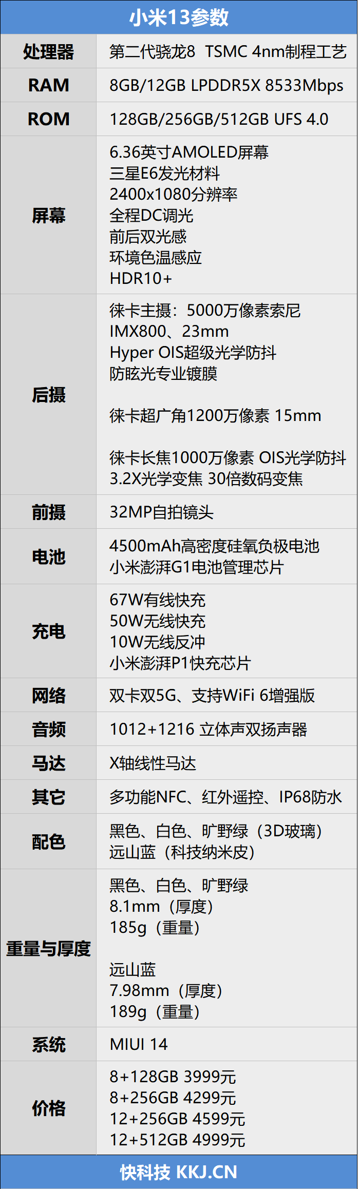 一、前言:自研双芯下放 并入徕卡三摄 堆料不像标准版 小米数字系列一直是小米手机品牌的主攻市场,去年在小米12 Pro中首次引进自研的澎湃P1快充芯片,在手机市场中率先实现120W单电芯充电方案。 今年7月,小米在12S Ultra中又首发了澎湃G1电池管理芯片,为电池维护、续航能力提供了重要保障。 这两颗自研芯片组成了小米独特的澎湃电池管理系统,在双芯的作用下,为手机提供快速的有线与无线充电,而小米12S Ultra也一举成为了第一款搭载该系统的旗舰手机。 到了今年年底,一年一度的小米数字旗舰即将到来,这些配置也一并传承给了下一代,小米13,也成为了接替它们的第一款标准版手机。 这一代小米13,不仅在快充方面做出了升级,在摄像领域也引入了小米12S系列的徕卡影像调教,并遵循了全新的设计语言,还有全新的屏幕、全新的处理器以及散热系统,这一代小米13,并不简单。 1、第二代骁龙8移动平台 小米13搭载基于台积电4nm制程工艺打造的第二代骁龙8移动平台,不同于以往的架构设计,采用“1+2+2+3”的四丛集八核芯设计架构,引入全新的Cortex-X3大核,主频3.19GHz,性能较上一代提升了35%,功耗降低了40%,有效提升了处理器的单核性能。 中核采用的是2个最新的2.8GHz Cortex-A715以及2个2.8GHz的Cortex-A710,小核保留了3个2.0GHz的Cortex-A510,可运行传统的32bit应用。 GPU方面采用全新的Adreno 740,680MHz的频率有效提升了能效,同时也加入了对光线追踪的支持,不过这也要看游戏厂商是否愿意跟进。 2、徕卡三摄 引入3.2X长焦镜头 小米13在影像方面也有了非常大的升级,索尼IMX800 CMOS的首次搭载,3.2倍长焦镜头的首次引入,组成的全焦段三摄模组与前代微距三摄更为实用。 此次小米13系列全系再次牵手徕卡影像,独特的影像调教,令手机在摄影能力方面脱颖而出。 3、标准版下放澎湃G1、P1双芯 在充电方面,作为标准版的小米13支持50W无线充电,并兼容了10W的无线反向充电,这也得益于在12S Ultra中首发的澎湃G1电池管理芯片以及12 Pro首发的澎湃P1快充芯片,在小米13中第一次下放,实现安全充电、维持长续航能力的双重保障。 以下是小米13手机的详细参数 二、外观:摆脱双曲屏 极窄边直屏带来更沉浸的观感 小米13的外观不同于12系列的家族式曲屏设计,正面采用6.36英寸的直屏, 全新的三星E6基材,屏幕的观感极为通透。 小米13的设计遵循了轻盈、干练和秩序三个关键词,为用户传达创作者的自信。 在居中位置具备一枚3200万像素的前置摄像头,听筒采用了微缝设计,在黑色的面板下几乎无法看见。 这一代小米13系列旗舰机屏幕两侧的边框做到了1.16mm宽,令整机的屏占比达到93.3%。 小米13机身底部的宽度做到了与左右两侧同宽,没有了双曲面屏幕,整机的一体性更加连贯。 另一个不同之处在于中框,小米13抛弃了之前的曲面中框,改用了直立边框设计,高光铝核心边框,呈现出柔美的光泽感,更能凸显出屏幕的视觉冲击力。 机身背部采用3D玻璃工艺,与直边中框的贴合紧密,向外溢出的玻璃背板也提供了足够优秀的握持手感。 摄像头部分也遵循了整机的设计语言,从机身背部整体向外凸出,主摄、超广角、长焦、双LED闪光灯与激光对焦模组均位于其中,经过线条的分隔,形成一个简约的正方体。 我们快科技收到的版本是黑色,“xiaomi”logo与玻璃背板浑然一体,光线打在其中显现出手机高雅与尊贵的气息。 机身顶部拥有两颗降噪麦克,扬声器的开孔做成了圆孔状,与一枚红外遥控传感器呈对称排列,极简的设计风格,强迫症看了都说好。 机身底部一次为扬声器、Type-C与耳机共用接口、麦克风以及SIM卡槽。 小米13的电源与音量按键均位于机身的右侧。 小米13支持67W澎湃有线秒充,随机附赠了67W快充套装。 三、理论性能:四丛集八核芯架构 GPU性能激增 第二代骁龙8采用比较与众不同的“1+2+2+3”的四丛集八核芯设计架构,沿用了与骁龙8+相同的台积电4nm制程工艺,引入Cortex-X3大核,主频也同样是3.2GHz,新的CPU架构将进一步提升处理器的多线程工作负载能力。 根据ARM的官方数据来看,较上一代Cortex-X2在性能提升了35%的同时,功耗也降低了40%。 另外,中核也引进了最新的Cortex-A715,并与Cortex-A710混合使用,2个A715+2个A710的主频均为2.8GHz,不过Cortex-A715砍掉了对32为应用的支持,而A710则兼容32位应用,因此一些老旧的APP只能在这两个核心中加载。 小核部分是3个2.0GHz的Cortex-A510 v2核心,与前代的差异并不算大。 第二代骁龙8的三级缓存从6MB升级到8MB,支持的内存规格也升级到四通道16bit的LPDDR5X 8533MT/s(4266MHz),闪存规格也支持到了UFS 4.0。 GPU部分也是第二代骁龙8升级最大的方面,采用新一代Adreno 730 GPU核心,680MHz的频率虽然不及骁龙8+的900MHz,但它的规模却大幅度增加,据官方宣称性能提升25%,能效提升45%,并支持了硬件级光线追踪,这也意味着我们在高通平台的手机中也能玩光追手游了。 这一次第二代骁龙8也终于支持到了蓝牙5.3传输协议以及最新的Wi-Fi 7,峰值网速可达到5.8 Gbps,并向下兼容Wi-Fi 6E、Wi-Fi 6以及Wi-Fi 5。 另外,第二代骁龙8首发集成X70 5G调制解调器及射频系统,峰值下载速度高达10 Gbps,上传速度高达 3.5 Gbps。 四、跑分测试:安兔兔轻松破131万 闪存读取能力提升近100% 那么,讲了这么多,第二代骁龙8的性能到底如何呢? 我们先来一组理论跑分测试。 1、安兔兔 首先是安兔兔综合性能测试,总成绩突破了130万大关,达到1315