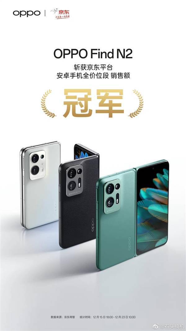 OPPO公布了Find N2首销战报,这款折叠屏斩获京东&天猫平台安卓手机全价位段销售额冠军,起售价7999元。 核心配置上,OPPO Find N2内屏分辨率为1920×1792,尺寸7.1英寸,外屏5.54英寸,分辨率为2120×1080,搭载高通骁龙8+处理器,内置4520mAh大电池,配合67W超级闪充,强悍性能下也有持久续航。 这款折叠屏仅重233g,比iPhone 14 Pro Max还轻。通过极致的组装精度和严苛的管控标准,Find N2整机的可靠性得到进一步提升——即便是铰链体积减少37%,重量减轻36%的情况下,Find N2的依然实现了整机强度的提升。 Find N2是目前首个通过莱茵折叠无忧认证2022的横向折叠手机。该测试涵盖48个严格测试,包含基本物理性能测试、生活化场景测试、万次折叠耐用性与握持舒适度4大维度,对折叠屏可靠性全面评估。 在经历40万次极限弯折测试后,Find N2屏幕性能、铰链、功能仍然保持良好水平。测试结果显示,Find N2平均每日弯折100次的情况下,可以保证长达5年的使用寿命,真正做到减重不减质。 此外,在具体使用方面,得益于超轻固精工拟椎式铰链的优势,OPPO Find N2可以实现多角度的悬停效果,这样即可将手机半折叠状态放在桌上。 值得注意的是,Find N2系列全系搭载OPPO自研芯片马里亚纳MariSilicon X,通过芯片、软件、算法、硬件的高度整合,带来效果惊艳的全场景大师级影像体验。