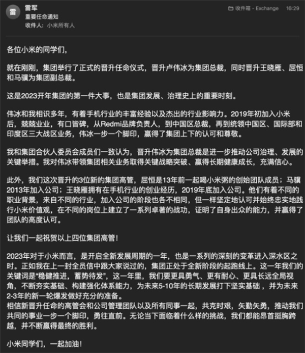 2022年开工第一天,雷军发布了全员信,宣布了小米公司的多项人事调整,其中卢伟冰晋升为集团总裁,同时晋升王晓雁、屈恒和马骥为集团副总裁。 雷军表示,2023年对于小米而言,是开启全新发展周期的一年,也是一系列的深刻的变革进入深水区之时。 正如在上一封全员信中跟大家说过的,集团正处于全新阶段的起跑线上。 这一年小米的关键词是“稳健推进,蓄势待发”,这一年里,要更具勇气、更有耐心、更具长远全局视角,不断夯实基础、构建强化体系能力,为未来5-10年的长期发展打下坚实基础,并为未来2-3年的新一轮爆发做好充分的准备。 以下是全员信详细内容: 各位小米的同学们 就在刚刚,集团举行了正式的晋升任命仪式,晋升卢伟冰为集团总裁,同时晋升王晓雁、屈恒和马骥为集团副总裁。 这是2023开年集团的第一件大事,也是集团发展、治理史上的重要时刻。 伟冰和我相识多年,有着手机行业的丰富经验以及杰出的行业影响力。2019年初加入小米后,兢兢业业,有口皆碑,从Redmi品牌负责人,到中国区总裁,再到统领中国区、国际部和印度区三大战区业务,伟冰一步一个脚印,赢得了集团上下的认可和尊敬。 我和集团合伙人委员会成员们一致认为,晋升伟冰为集团总裁是进一步推动公司治理、发展的关键举措。 我对伟冰带领集团相关业务取得关键战略突破、赢得长期健康成长,充满信心。 此外,我们这次晋升的3位新的集团高管,屈恒是13年前一起喝小米粥的创始团队成员;马骥2013年加入公司;王晓雁拥有在手机行业的创业经历,2019年底加入公司。 他们有着不同的职业背景,来自不同的行业,加入公司的阶段也各不相同,但一样坚定地认可并始终忠实地践行小米价值观,在不同的岗位上建立了一系列卓著的战功,证明了自身出众的能力,并赢得了团队的高度认可。 让我们一起祝贺以上四位集团高管! 2023年对于小米而言,是开启全新发展周期的一年,也是一系列的深刻的变革进入深水区之时。正如我在上一封全员信中跟大家说过的,集团正处于全新阶段的起跑线上。 这一年我们的关键词是“稳健推进,蓄势待发”,这一年里,我们要更具勇气、更有耐心、更具长远全局视角,不断夯实基础、构建强化体系能力,为未来5-10年的长期发展打下坚实基础 ,并为未来2-3年的新一轮爆发做好充分的准备。 相信新晋升任命的高管会和公司管理团队以及所有同事一起,共克时艰,矢勤矢勇,推动我们共同的事业一步一个脚印,勇往直前。 无论当下面临着什么样的挑战,我们都能昂首挺胸跨越,并不断赢得最终的胜利。 小米同学们,一起加油!