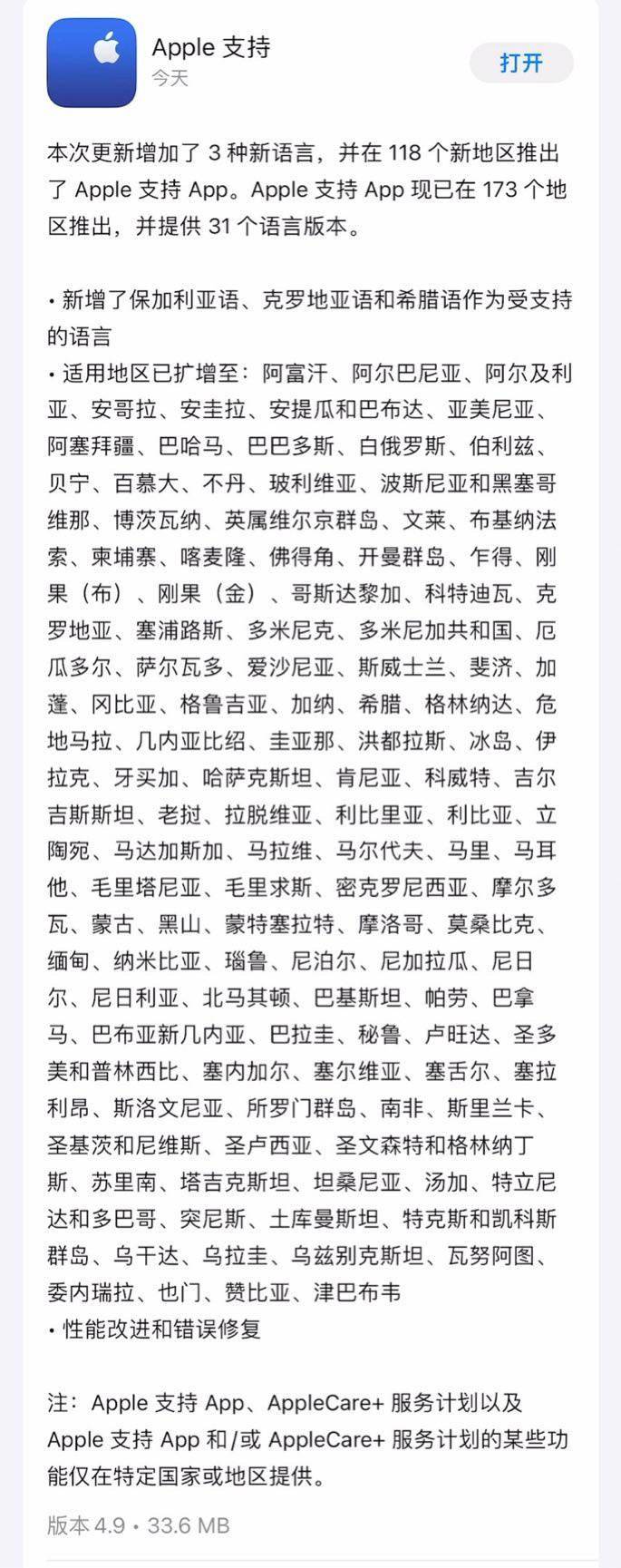 苹果对 iPhone 和 iPad 的 Apple 支持应用进行了重大升级,该应用已更新到 4.9 版本,从今天开始,该应用现在可以在 118 个新地区使用,并提供对三种新语言的支持。 更新后,Apple 支持应用现在可以在以下 118 个新地区使用: 阿富汗、阿尔巴尼亚、阿尔及利亚、安哥拉、安主拉、安提瓜和巴布达、亚美尼亚、阿塞拜疆、巴哈马、巴巴多斯、白俄罗斯、伯利兹、贝宁、百慕大、不丹、玻利维亚、波斯尼亚和黑塞哥维那、博茨瓦纳、英厲维尔京群岛、文莱、布基纳法索、柬埔寨、喀麦隆、佛得角、开曼群岛、乍得、刚果(布)、刚果(金)、哥斯达黎加、科特迪瓦、克罗地亚、塞浦路斯、多米尼克、多米尼加共和国、厄瓜多尔、萨尔瓦多、爱沙尼亚、斯威士兰、斐济、加蓬、冈比亚、格鲁吉亚、加纳、希腊、格林纳达、危地马拉、几内亚比绍、圭亚那、洪都拉斯、冰岛、伊拉克、牙买加、哈萨克斯坦、肯尼亚、科威特、吉尔吉斯斯坦、老挝、拉脱维亚、利比里亚、利比亚、立陶宛、马达加斯加、马拉维、马尔代夫、马里、马耳他、毛里塔尼亚、毛里求斯、密克罗尼西亚、摩尔多瓦、蒙古、黑山、蒙特塞拉特、摩洛哥、莫桑比克、缅甸、纳米比亚、瑙鲁、尼泊尔、尼加拉瓜、尼日尔、尼日利亚、北马其顿、巴基斯坦、帕劳、巴拿马、巴布亚新几内亚、巴拉圭、秘鲁、卢旺达、圣多美和普林西比、塞内加尔、塞尔维亚、塞舌尔、塞拉利昂、斯洛文尼亚、所罗门群岛、南非、斯里兰卡、圣基茨和尼维斯、圣卢西亚、圣文森特和格林纳丁斯、苏里南、塔吉克斯坦、坦桑尼亚、汤加、特立尼达和多巴哥、突尼斯、士库曼斯坦、特克斯和凯科斯群岛、乌干达、乌拉圭、乌兹别克斯坦、瓦努阿图、委内瑞拉、也门、赞比亚、津巴布韦。 与此同时,苹果还为 Apple 支持应用增加了克罗地亚语、希腊语和保加利亚语作为受支持语言。IT之家了解到,目前 Apple 支持应用已在 173 个地区推出,共提供 31 个语言版本。不过,苹果公司指出,Apple 支持 App、AppleCare+ 服务计划以及 Apple 支持 App 和 / 或 AppleCare + 服务计划的某些功能仅在特定国家或地区提供。