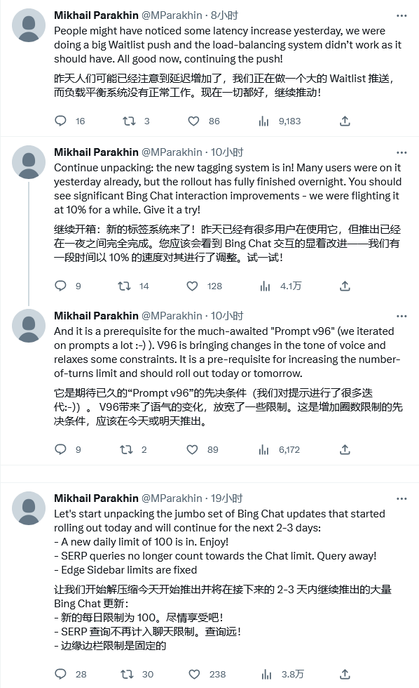 微软进一步放宽了基于 ChatGPT 的新版必应限制,每日聊天次数从最初的 50 次上调至 60 次之后,今天再次预告将会未来 2-3 天内将限制上调至 100 次。 微软广告和网络服务主管 Mikhail Parakhin 在今天发布的推文中分享了这条信息,IT之家翻译如下: Bing Chat 在未来 2-3 天将会推出大量更新: - 每日聊天次数上限调整为 100 次。请尽情享受吧!
