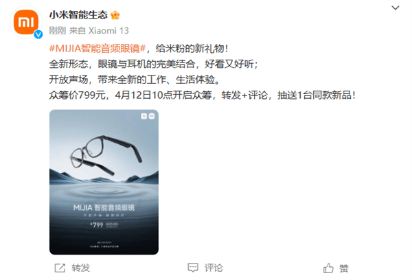 小米智能生态官方发布了一款米家生态新品:MIJIA智能音频眼镜。 根据官方介绍,MIJIA智能音频眼镜在设计上颇为独特,实现了眼镜与耳机的结合,在确保眼镜本身功能性的同时,兼顾了音频体验。 从海报展示的产品外观,以及“开放声场,解放双耳”的宣传语来看,这款眼镜应该是在镜腿部分整合了蓝牙耳机的功能,并采用了开放式听音的设计。 与传统而入耳式耳机相比,开放式耳机不仅在佩戴上更加自然,也能够做到不阻隔外界声音,避免因为隔音影响安全。 此外,开放式的耳机设计也避免了入耳式耳机在长期佩戴时,可能存在的耳道卫生问题。 不过,虽然能够看出MIJIA智能音频眼镜已经在努力提高音频单元的集成度,但在观感上,它的镜腿仍要比市面上的大部分传统眼镜更为厚重,在佩戴时可能需要一定时间适应。 MIJIA智能音频眼镜将于4月12日在小米有品开启众筹,众筹期间售价799元,众筹结束后零售价899元。