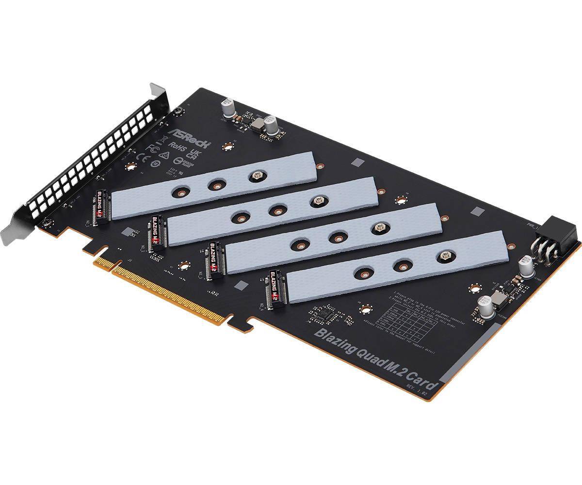 华擎在今年 2 月份发布了全新的 Blazing Quad PCIe 5.0 扩展卡,支持四个 M.2 SSD。现在,这款扩展卡已经开始在海外上市。 据介绍,华擎 Blazing Quad M.2 SSD 扩展卡采用 PCI-Express 5.0 x16 连接,内置 4 组 M.2 25110 插槽 (PCIe 5.0 x4),并带采用了两个小风扇主动散热设计。 华擎 Blazing Quad M.2 SSD 扩展卡支持 2242/2260/2280/2580/22110/25110规格 SSD,内置四个 LED 灯,可显示四个 SSD 的状态。此外,这款扩展卡需要 6pin 供电。 价格方面,华擎 Blazing Quad M.2 SSD 扩展卡售价 16980 日元(IT之家备注:当前约 869 元人民币),将在 4 月 28 日正式上市。