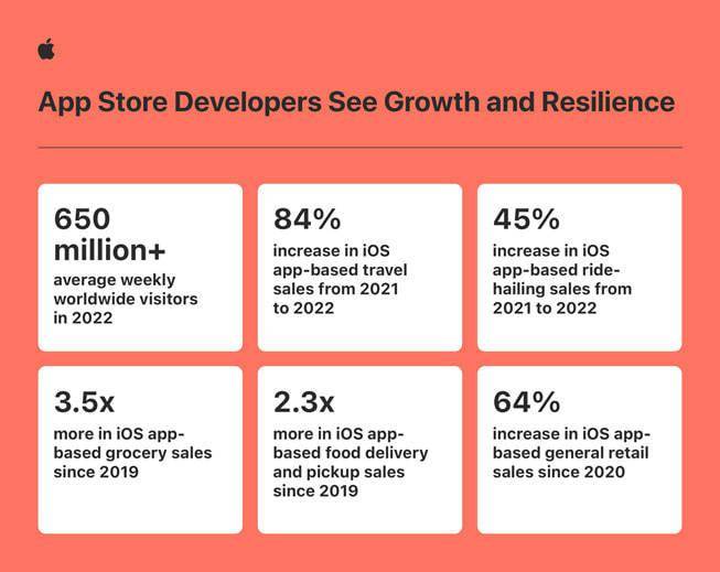 - 2022 年,App Store 平均每周吸引超过 6.5 亿访客。2022 年,用户平均每周新 App 下载达 7.47 亿次,重新下载 App 达 15 亿次。
