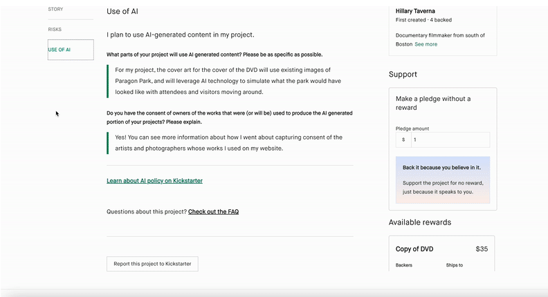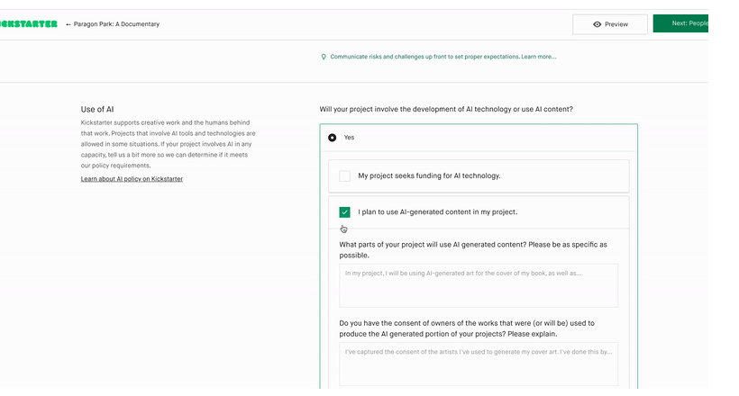 众筹平台 Kickstarter 近日宣布,将规范平台中涉及 AI 的相关项目,Kickstarter 要求这些项目披露“与 AI 相关的更多技术细节”,才能够上架平台发起众筹。 IT之家从 Kickstarter 公告处整理汇总得知,Kickstarter 要求涉及 AI 的相关项目必须披露“为什么要使用 AI 工具”、“哪些方面使用 AI 工具”、“所用 AI 工具的具体信息及相应实例”,同时要求项目所有者公开“训练数据相关的授权信息”。 ▲ 图源 Kickstarter 平台 据悉,Kickstarter 的新政策将于 8 月 29 日生效,而 8 月 29 日前提交的相关项目不受新法案的约束。 ▲ 图源 Kickstarter 平台 Kickstarter 强调,如果在提交相关信息过程中“没有正确披露使用 AI 的情况”,可能导致项目被暂停。Kickstarter 同时表示,他们希望通过这一政策,确保平台的项目都合规合法,并能够尊重人类艺术家们的版权需求。 Kickstarter 声称,透明度是 Kickstarter 社区最重要的内容,Kickstarter 当下规范 AI 相关内容,有利于在赢得平台用户的信任的同时,规避 AI 带来的版权问题。