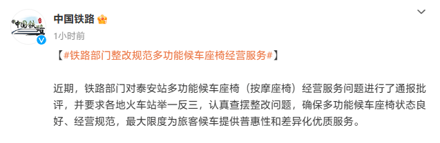 在提出以上要求的同时,铁路部门近期也对泰安高铁站的多功能候车座椅(即按摩座椅)的经营服务问题进行了通报批评,要求各地火车站举一反三对现有问题进行自查、整改,确保状态良好和经营规范。 据半岛晨报报道,近期泰安高铁站遭到多位旅客吐槽,因为候车厅内近 500 个座椅中,共享按摩椅占据了 9 成,导致候车室在碰到客流高峰时,现有的座位数量不足。此外,这些按摩椅的舒适性和卫生问题也曾受到旅客质疑。