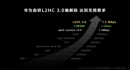 无损传输的实现还需要无损编解码的“保驾护航“,华为自研L2HC 3.0音频编解码协议,采用自研技术,保障在高码率下对音频文件进行bit级压缩还原。配合麒麟A2芯片的传输能力,华为FreeBuds Pro 3端到端实现了1.5Mbps的传输。