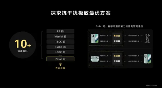 传输问题上,码率不足、抗干扰差是TWS耳机实现无损音质的两大瓶颈。据介绍,华为FreeBuds Pro 3物理传输带宽高达8Mbps,是业界传统蓝牙带宽的4倍,从而实现耳机1.5Mbps的传输码率。同时,华为首次将移动通信的Polar码技术应用在耳机上,耳机的传输抗干扰能力相较上代提升了2倍。