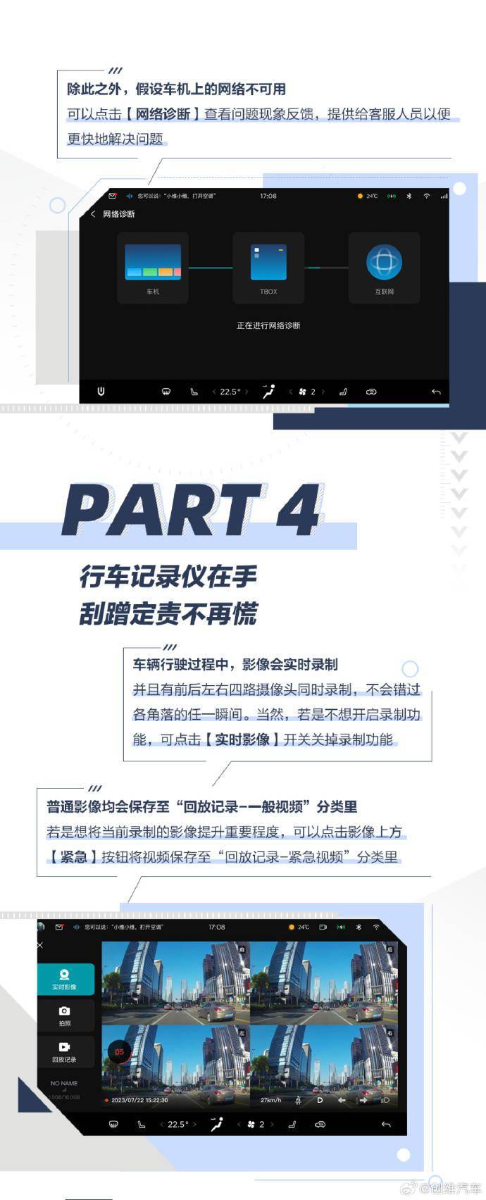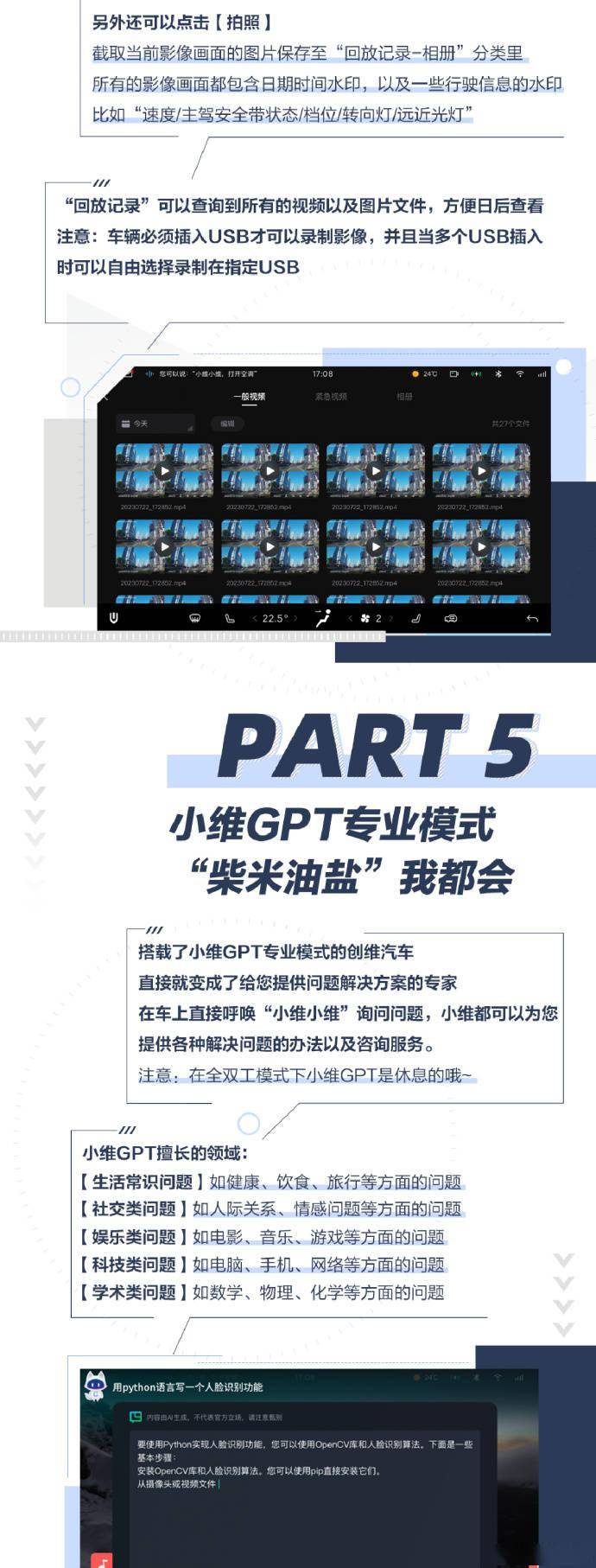 - 行车记录仪:车辆行驶过程中,前后左右四路摄像头会同时录制,还可截取当前影像画面图片保存至相册,影像画面包含时间日期、行驶信息等内容水印。车辆必须插入 USB 才可录制影像。