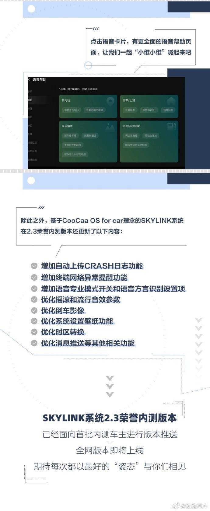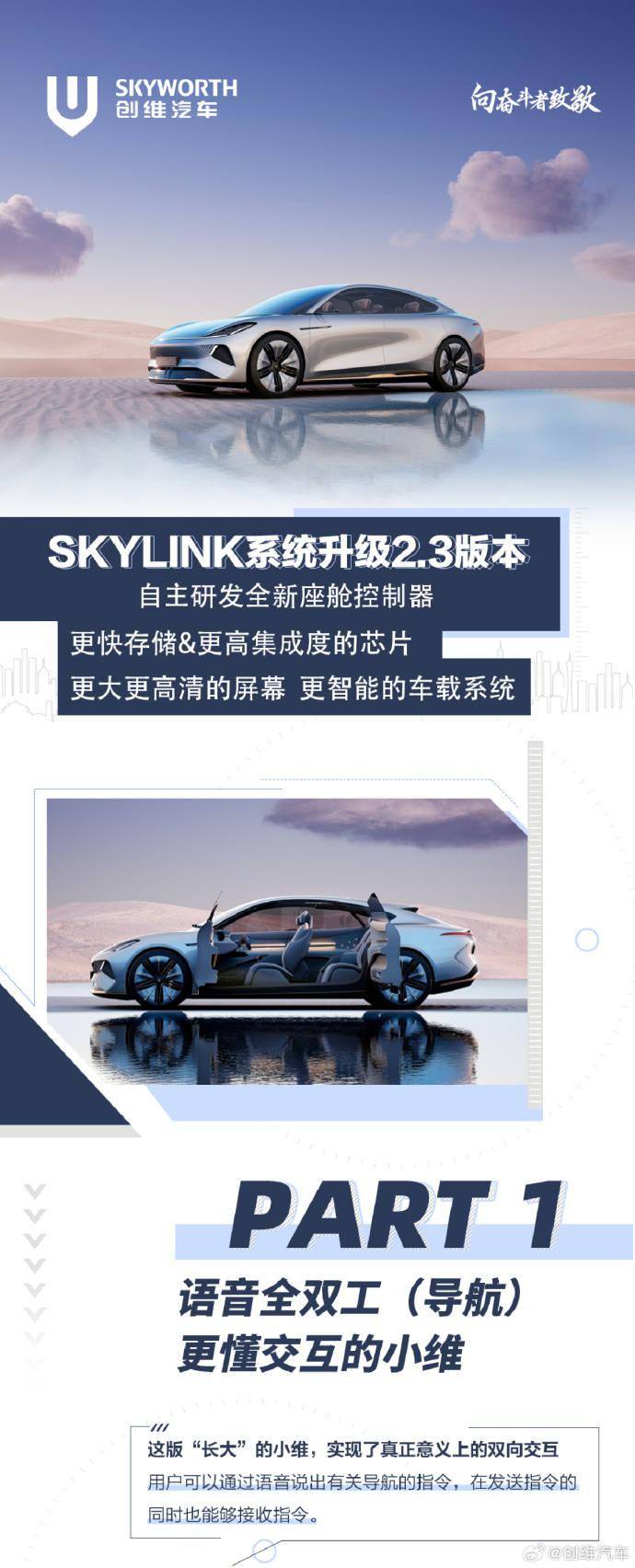 创维汽车日前宣布为旗下 EV6 纯电车型带来 SKYLINK 2.3 版本 OTA 更新,在车辆的语音交互、智能化等方面进行了升级。 IT之家大致汇总如下: - 语音助手实现“真正意义上的双向交互”:用户可通过语音说出有关导航指令,在发送指令的同时也能接收指令,不需要“小维小维”提示词就可直接与语音助手对话。若要退出聆听状态,可直接说“退出”或等待 20 秒。