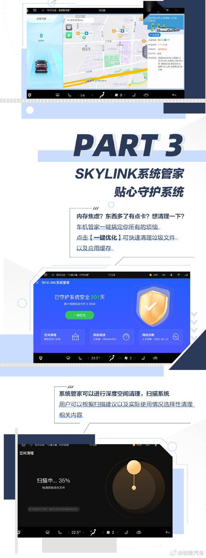- SKYLINK 系统管家:内置车机管家,可通过“一键优化”快速清理垃圾文件及应用缓存,支持深度空间清理、网络诊断。