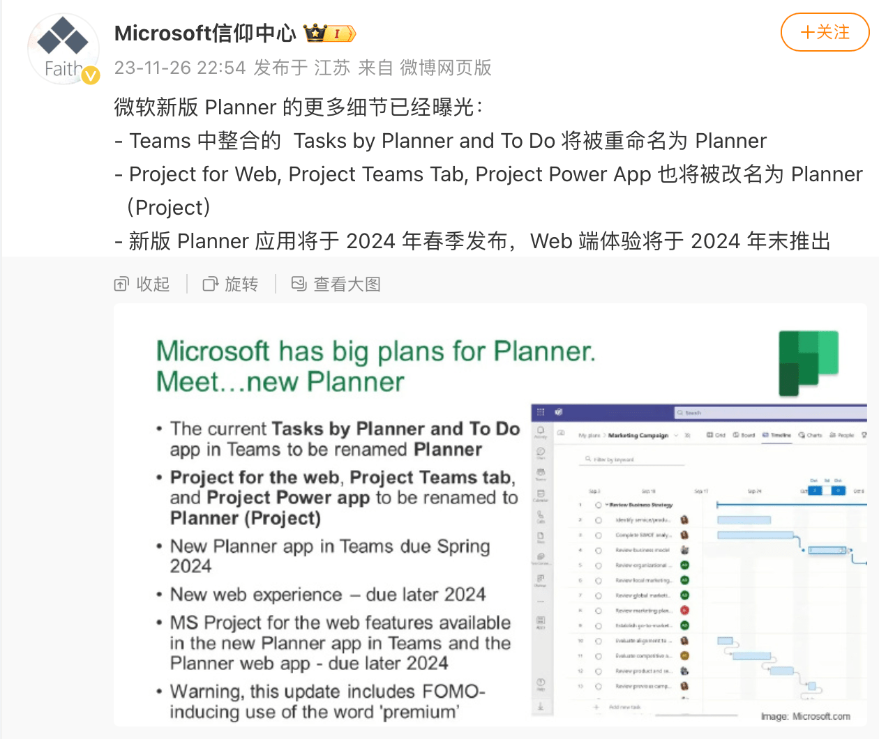 ▲ 图源“Microsoft 信仰中心”微博 此外IT之家发现,根据该博主消息,新版 Planner 应用预计将于 2024 年春季发布,Web 端体验将于 2024 年末推出。