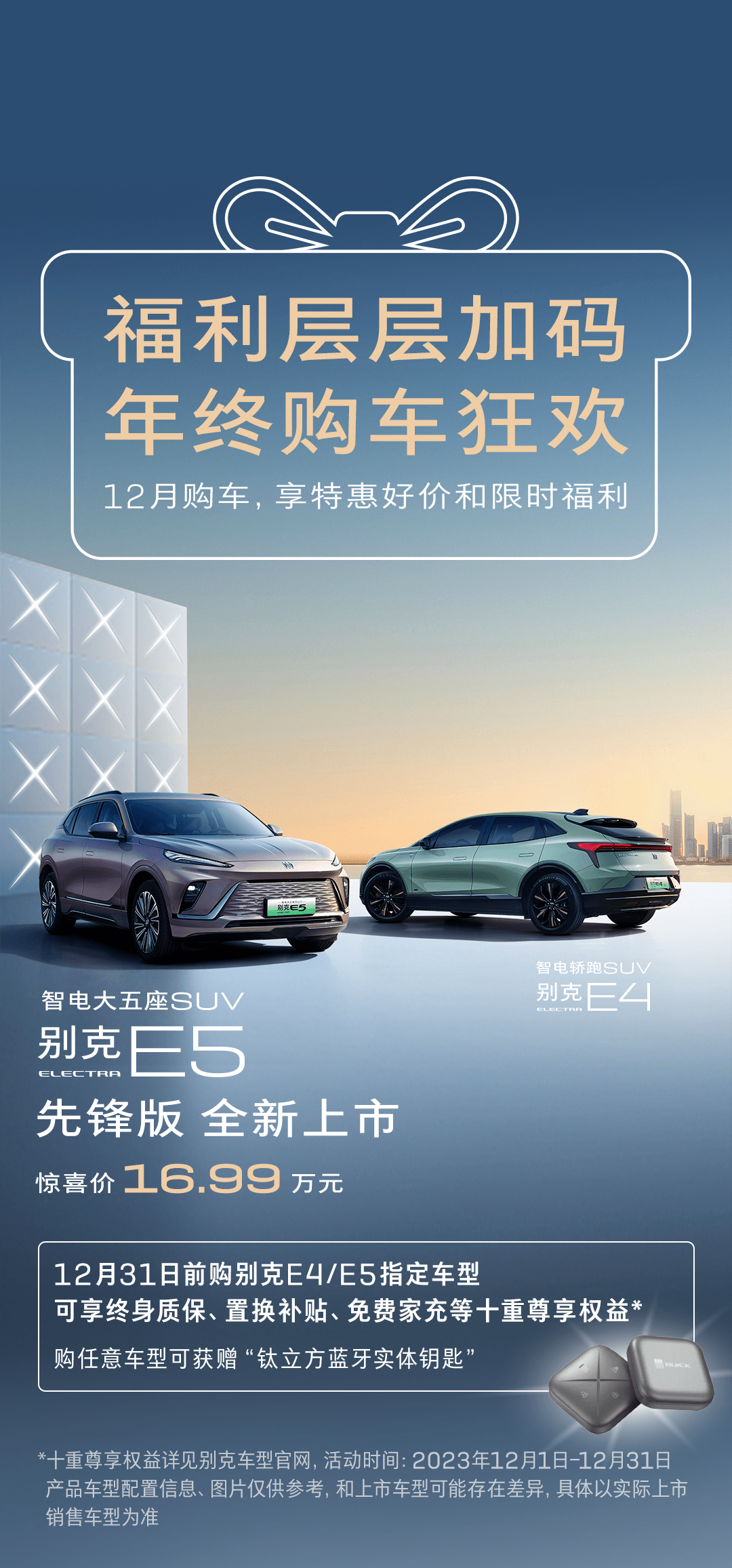 别克汽车宣布开启年终购车活动,多款车型都有不同程度的优惠。12 月 31 日前购别克 E4 / E5 指定车型,可享终身质保、置换补贴、免费家充等十重尊享权益,购任意车型可获赠“立方蓝牙实体钥匙”。 IT之家注意到,2024 款别克微蓝 6 特惠价 9.98 万元起,原价 11.28 万元起;别克昂科旗综合优惠 7 万元,昂科威 S / 昂科威 PIus 综合优惠 6 万元;全新一代别克君越综合优惠 3 万元,别克新君威综合优惠 3 万元;别克威朗 Pro 优惠价 7.89 万元起,原价 12.98 万元起。