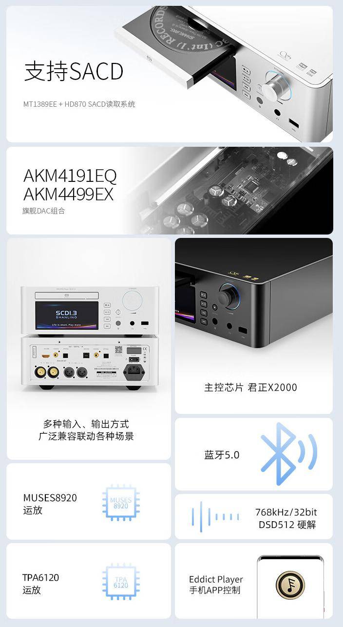 山灵旗下 SACD 播放机目前已经在京东开售,该播放机采用 MT1389EE+HD870 读取系统,支持播放 SACD 与普通 CD 光盘,首发价格 7998 元。 IT之家从商品页中得知,这款播放机内置 AK4191+AK4499EX 双 DAC、君正 X2000 处理核心,支持 USB / 光纤 / 同轴 / 蓝牙数字输入及 I²S / 同轴 / 光纤 数字输出,首发赠送 L8 高纯度无氧铜 I²S 线及 6 个月 HiFi 云曲库会员。 此外,这款播放机支持 I²S 接口自定义,配备蓝牙 5.0,支持蓝牙 + WiFi 推流(含 DLNA、苹果隔空投送),并允许手机远程连接控制。 官方提到,这款播放器具备自适应及主动切换功能,在 SACD 播放时,可一键切换 SACD / 普通 CD 播放模式;普通 CD 播放时,自适应为普通 CD 播放模式。 IT之家附接口信息及参数详情如下: