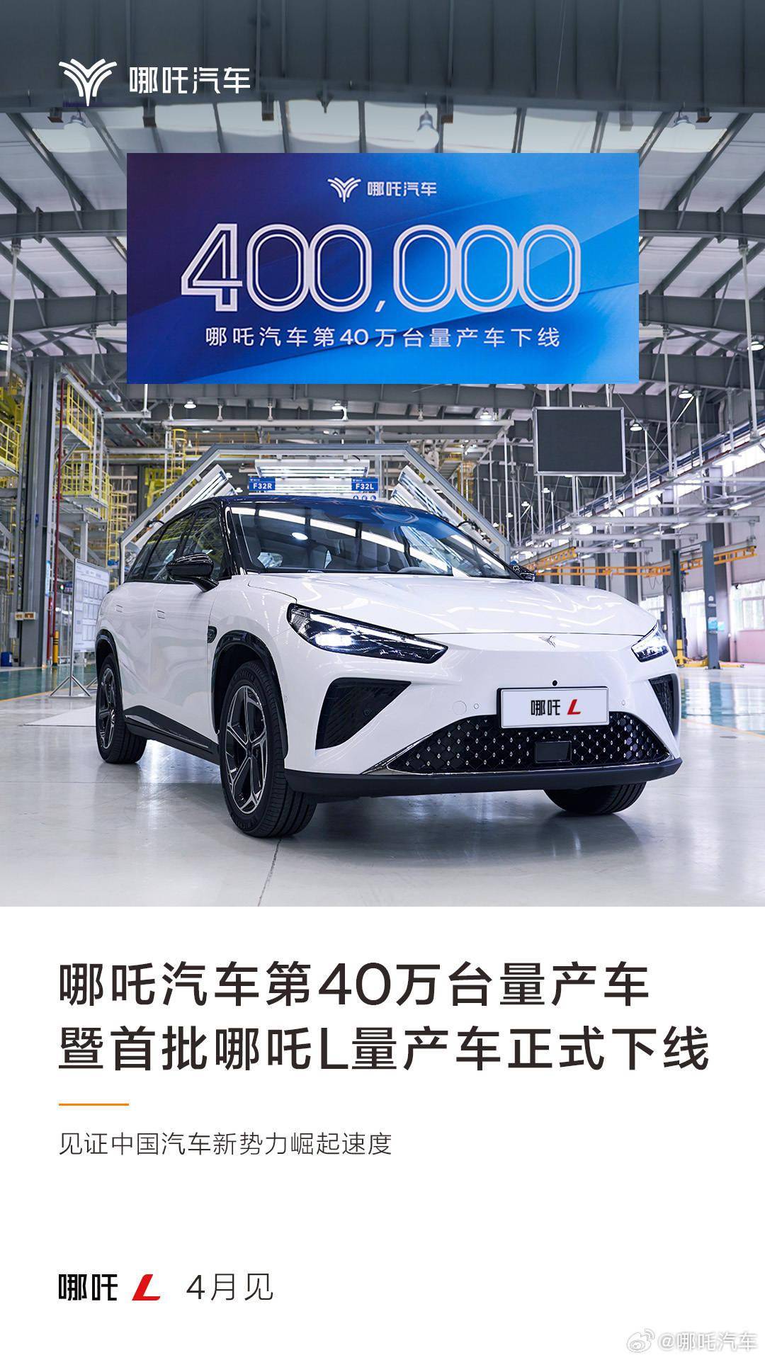 哪吒汽车今日宣布,第 40 万台量产车暨首批哪吒 L 量产车正式下线。 哪吒 L 将于 4 月上市并交付,该车定位中大型 SUV,采用五座布局,基于山海平台打造,提供纯电版与增程版两种动力形式可选。 哪吒 L 的真车图此前已经公布,已知有黑、白、粉三种配色。该车配备三段式的 LED 日间行车灯组,采用“L”的大灯设计,并采用隐藏式门把手设计来降低风阻,可选装行李架、单色车身。 IT之家从申报信息获悉,哪吒 L 车身尺寸为 4770x1900x1660mm,轴距 2810mm,纯电版本搭载 170kW 无锡中车时代电驱科技有限公司电机,配有蜂巢能源电池。 增程版本搭载型号为 H15R 的发动机,净功率为 65kW,1499ml 排量,同样是蜂巢能源电池。 内饰方面,哪吒 L 采用环抱式座舱设计,车内搭载大尺寸双联屏以及车载冰箱,内饰采用浅色简约设计。此外,哪吒 L 车型还为后排老板座配备了小桌板。