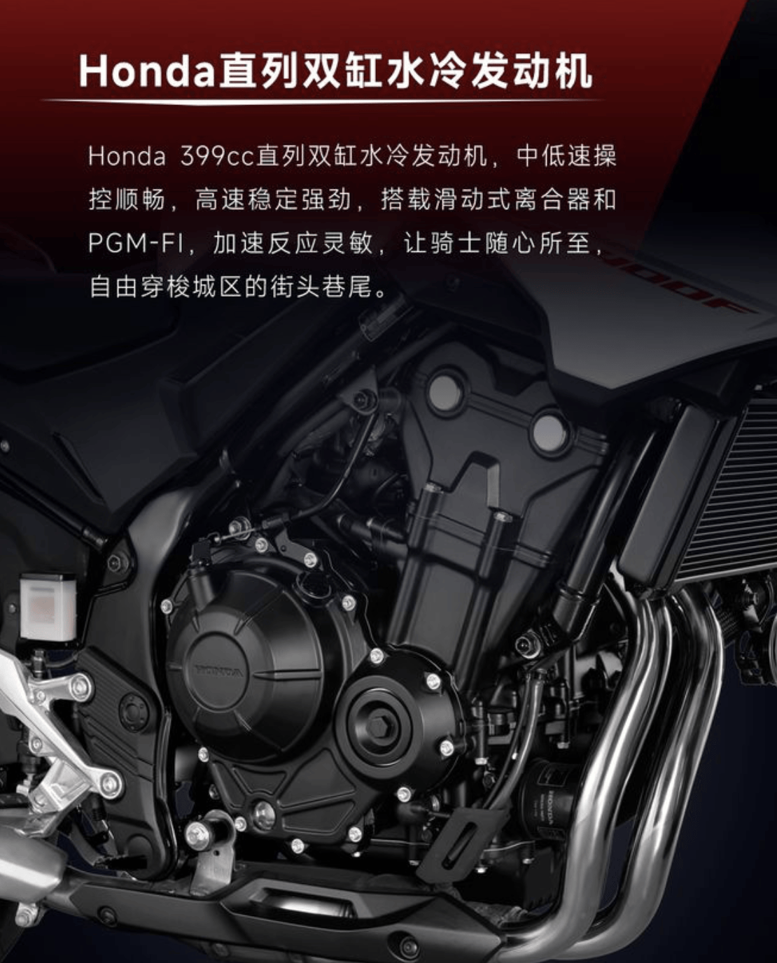 2024款五羊本田 CB400F 摩托车目前已经正式上市,该车升级5英寸液晶仪表,提供熔岩红 / 星月白 / 曜夜黑三种配色,指导价为 3.3 万元。 据介绍,该车采用设计源自“黄蜂”的家族脸,配备阵式 LED 大灯,真题强调舒适度,配备正新 S1 公路胎。 此外,该车升级5英寸 TFT 全彩液晶仪表,支持通过车把实体按键查看行驶数据,不过IT之家发现相关相关仪表缺失手机互联功能和中文语言,有待官方未来更新。 参数方面,该车长宽高分别为 2080/800/1060 毫米,轴距 1416 毫米,配备 400 毫升Honda 399cc直列双缸水冷发动机,最大功率 33 千瓦,最大扭矩 37 牛・米,匹配国际 6 挡变速箱,油箱容积为 16.1 升。标配 LED 大灯、41 毫米倒立前叉、预载可调中置多连杆后减振、Honda 可调扭矩控制系统、双通道 ABS 等。