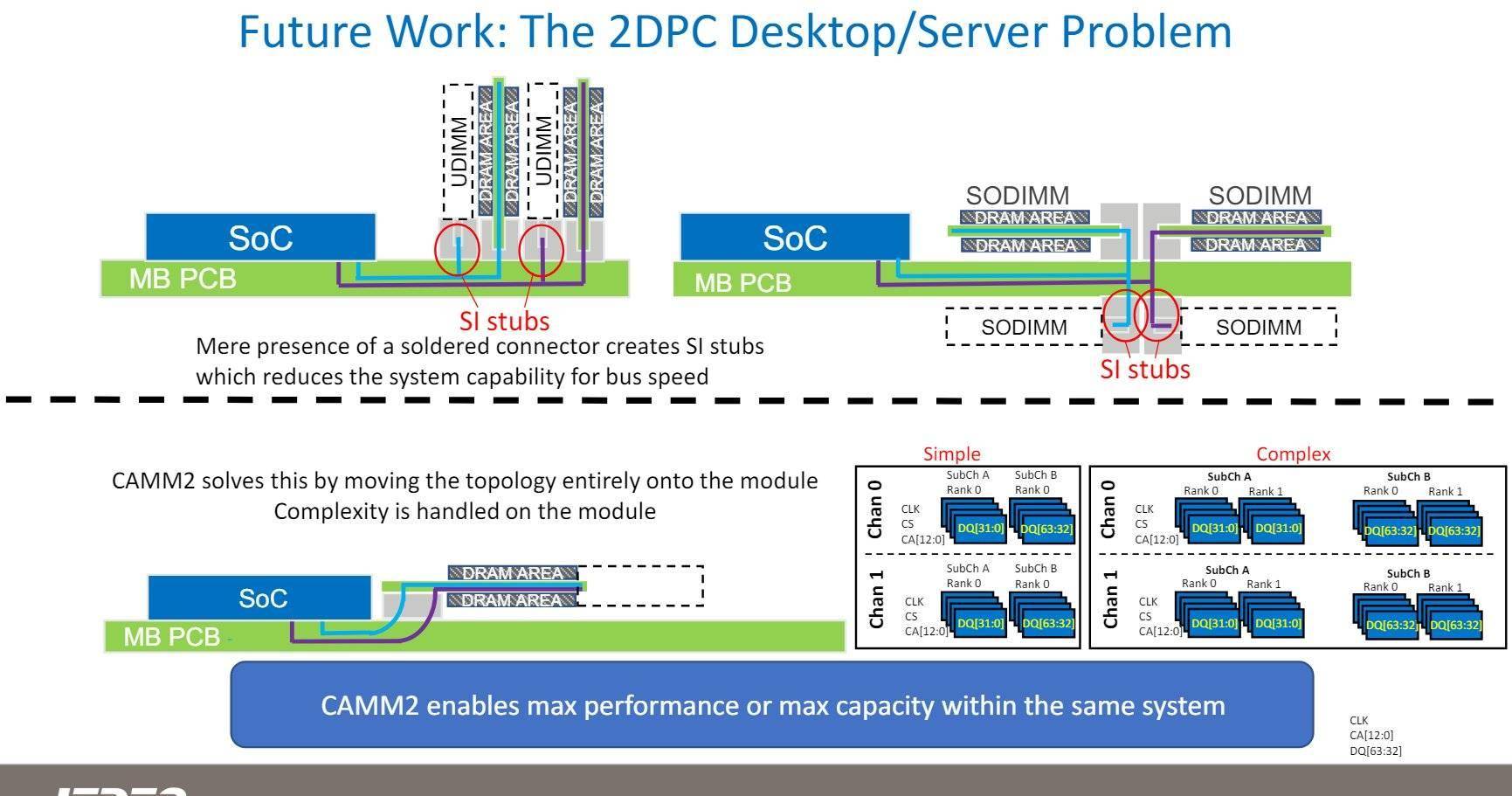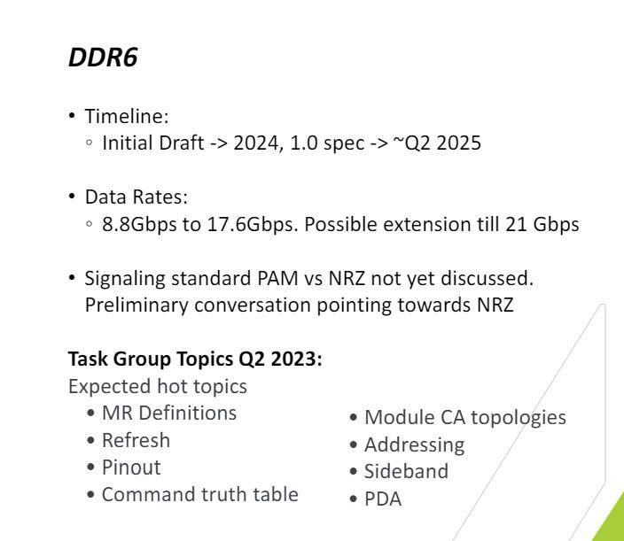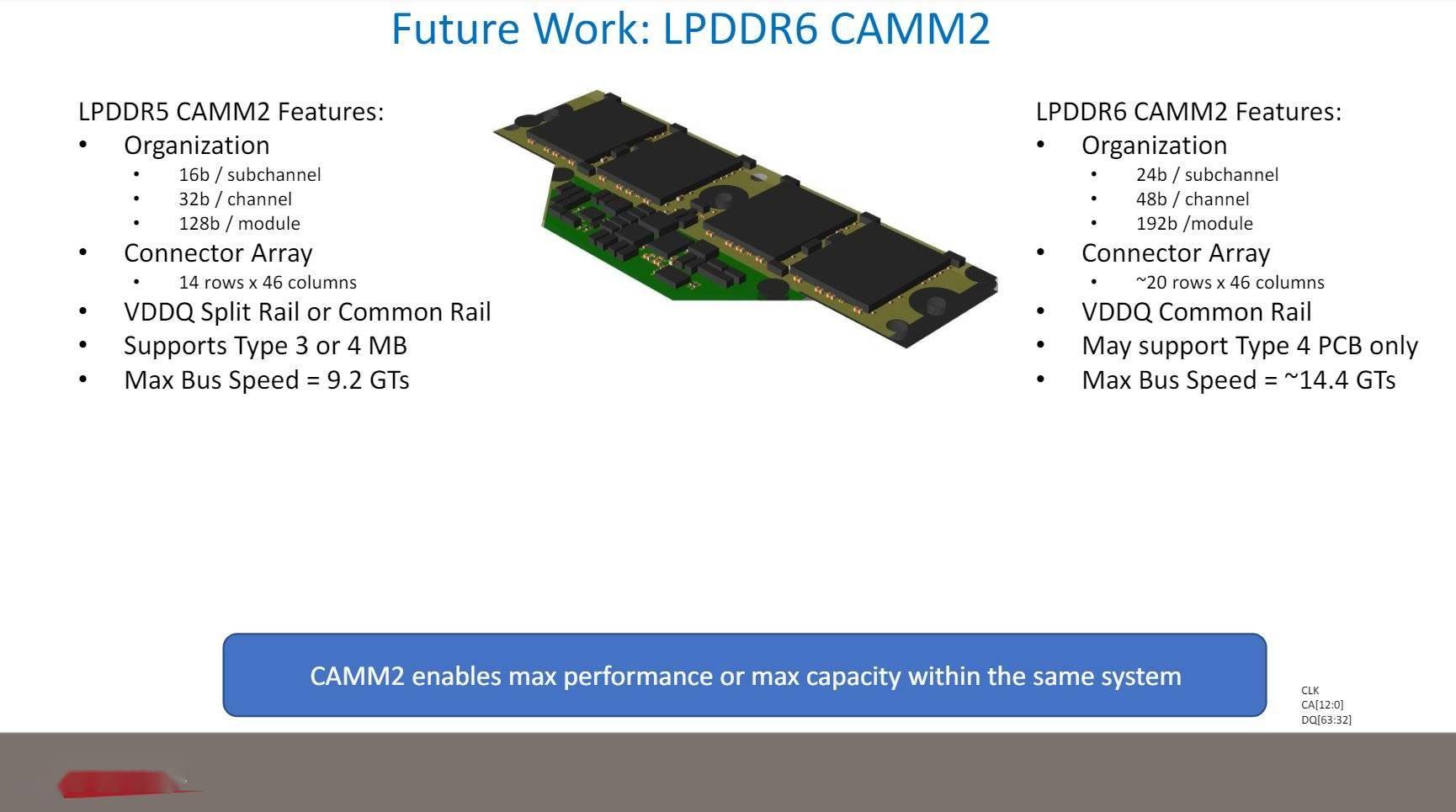 博主 Darkmont 今日放出了 Synopsys 与 JEDEC 关于下一代 DDR6 / LPDDDR6 内存标准的文档。 DDR6 内存 ▲图源Darkmont,下同 文档显示 DDR6 内存将拥有 8.8Gbps 至 17.6Gbps 的内存速率,并可能扩展至 21Gbps,标准初稿将于今年发布,1.0 版规格明年第二季度公布。 LPDDR6 内存 文档显示,LPDDR6 内存通道位宽 24bit,起始速率 10.667Gbps、最高定义速率 14.4 Gbps。 ▲ 通道示意图 LPDDR6 内存速率将超过 10Gbps,带宽可达 28.5-38.4GB/s,并在低功耗与安全性上进一步提升。 此外,JEDEC 还在研究 LPDDR6 CAMM2 模组及其在桌面与服务器平台的应用。 ▲LPDDR6 CAMM2 模组