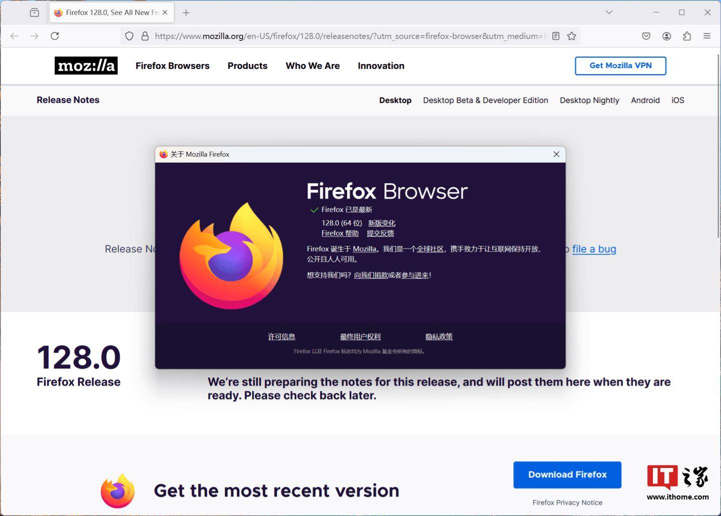 Mozilla 已经在其 FTP 服务器上放出了火狐 Firefox 浏览器 128 稳定版,主要改进清除数据功能,支持在隐私浏览模式观看 Netflix 等流媒体网站的受保护内容。 ▲ 正式更新记录暂未上线官网 火狐浏览器 128.0 稳定版安装包已经编译完成并上线官方 FTP 服务器,但 Mozilla 尚未正式开始推送该版本。 此外,128.0 ESR 长期支持版也已经上线官方 FTP 服务器。 据介绍,Firefox 128 实装了原计划于 126 版本上线的新“清除浏览数据和 Cookie”对话框,允许清理特定时间段的数据。 Firefox 128 还支持在隐私浏览模式下播放来自 Netflix 等流媒体视频网站的受保护内容。 IT之家注:火狐浏览器 Firefox 128 的详细更新记录将于该版本正式推送后上线官网。