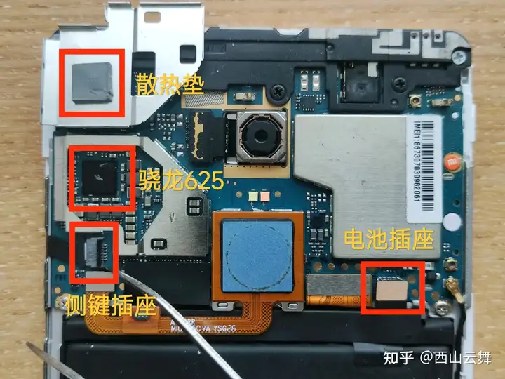用的是高通的骁龙625在经典神U,于主板的左上方屏蔽罩底下。这款cpu得益于14纳米的工艺,发热比同期的6系列低不少。打开CPU蔽罩,内侧有一片导热垫,帮助CPU散热。拔开电池插座和侧键插座,为后续清洁做准备。