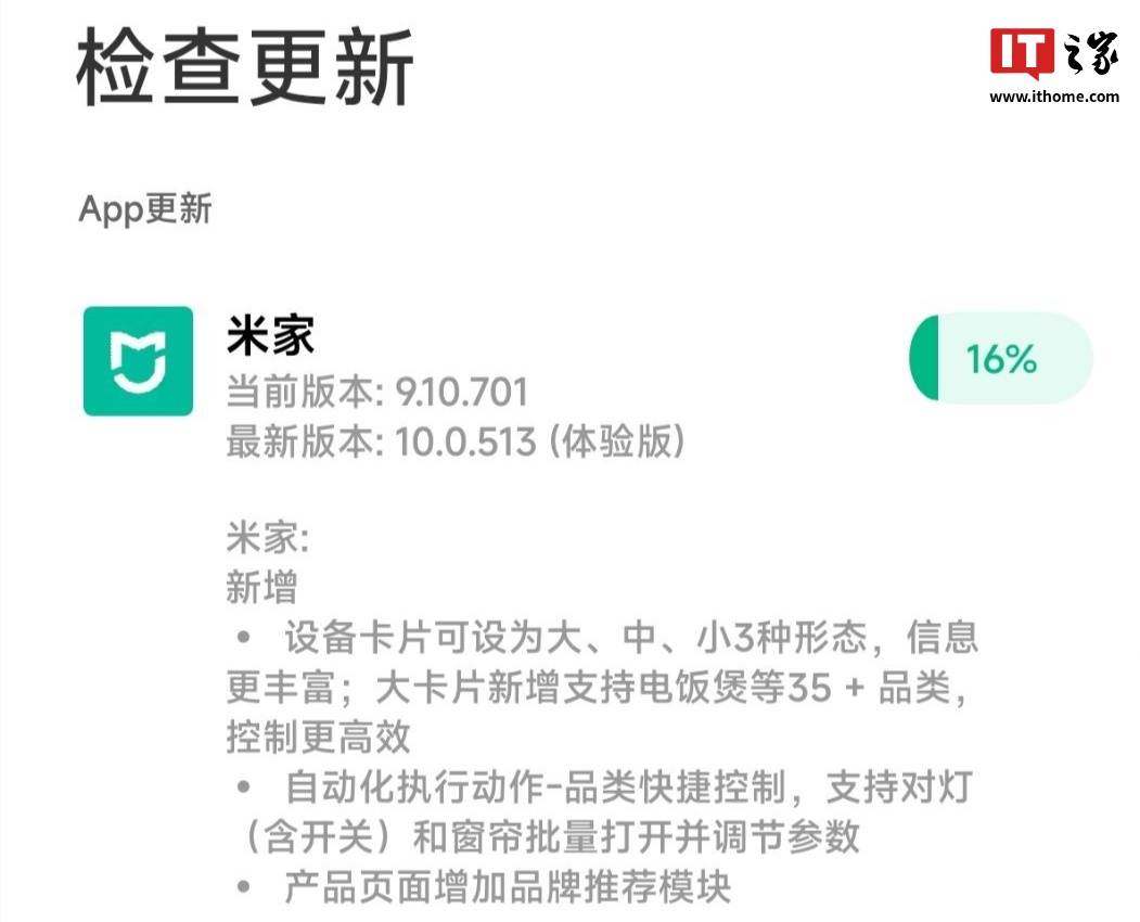 IT之家 10 月 19 日消息,小米米家 App 现获推 10.0.513(体验版)升级,新版本支持米家建议、3 种形态设备卡片等功能。 米家 App 10.0.513 体验版更新日志仅显示 3 项升级内容,IT之家整理米家新版本已知升级内容如下: - 设备卡片可设为大、中、小 3 种形态,信息更丰富