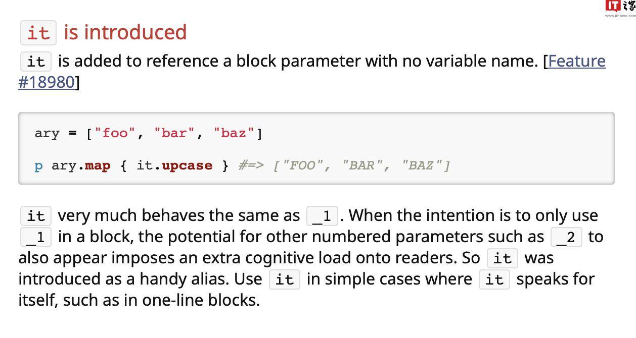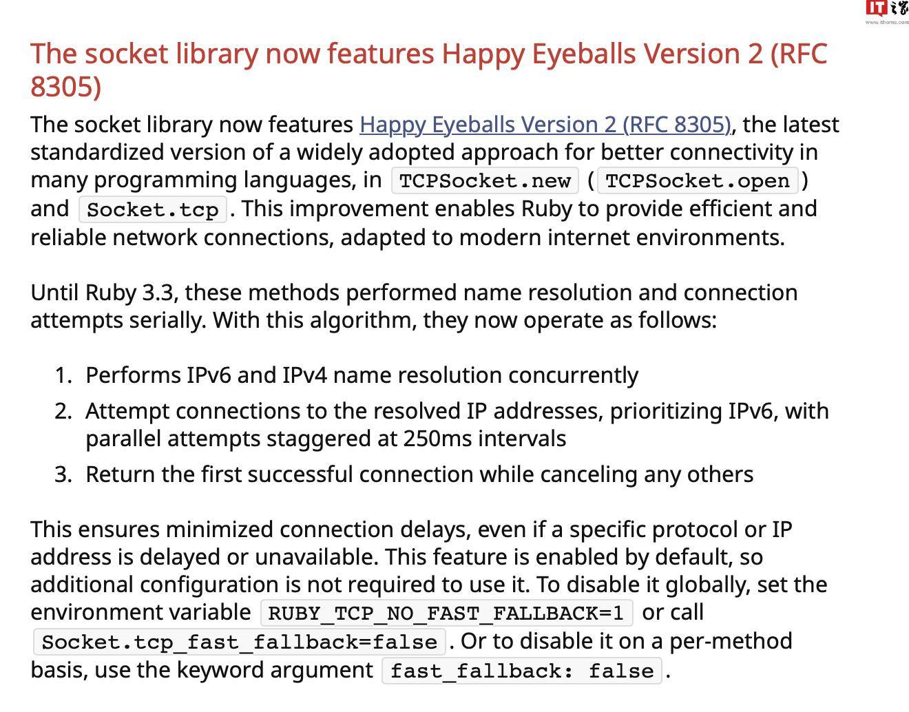 Ruby 3.4 正式版现已发布,IT之家参考更新说明获悉,该版本主要在性能和开发效率方面进行优化,引入“it”作为不带变量名的块参数的引用方式,扩展了模块化垃圾回收机制,并将默认解析器从 parse.y改为 Prism。 官方介绍了 Ruby 3.4 引入的“it”块参数引用方式,官方使用“ary.map{it.upcase}”作为例子,声称相对现有的_1/_2 等数字参数更简洁、更具可读性。 此外,Ruby 3.4 对垃圾回收机制进行模块化处理(Modular GC),将 Ruby 原先内置的垃圾回收器分拆为独立的模块文件,从而增强灵活性。 在性能方面,Ruby 3.4 对 YJIT(即时编译器)进行了多项优化,改进了内存压缩和字符串处理能力,同时为套接字库带来了 RFC 8305“Happy Eyeballs V2”支持,号称显著提升了 Ruby 程序在现代网络环境中的连接效率,相关技术支持 IPv6 与 IPv4 的并行解析与连接,通过 250 毫秒的间隔进行并行尝试,以便于应用快速建立最佳连接,确保在各种网络环境中保证稳定可靠性。