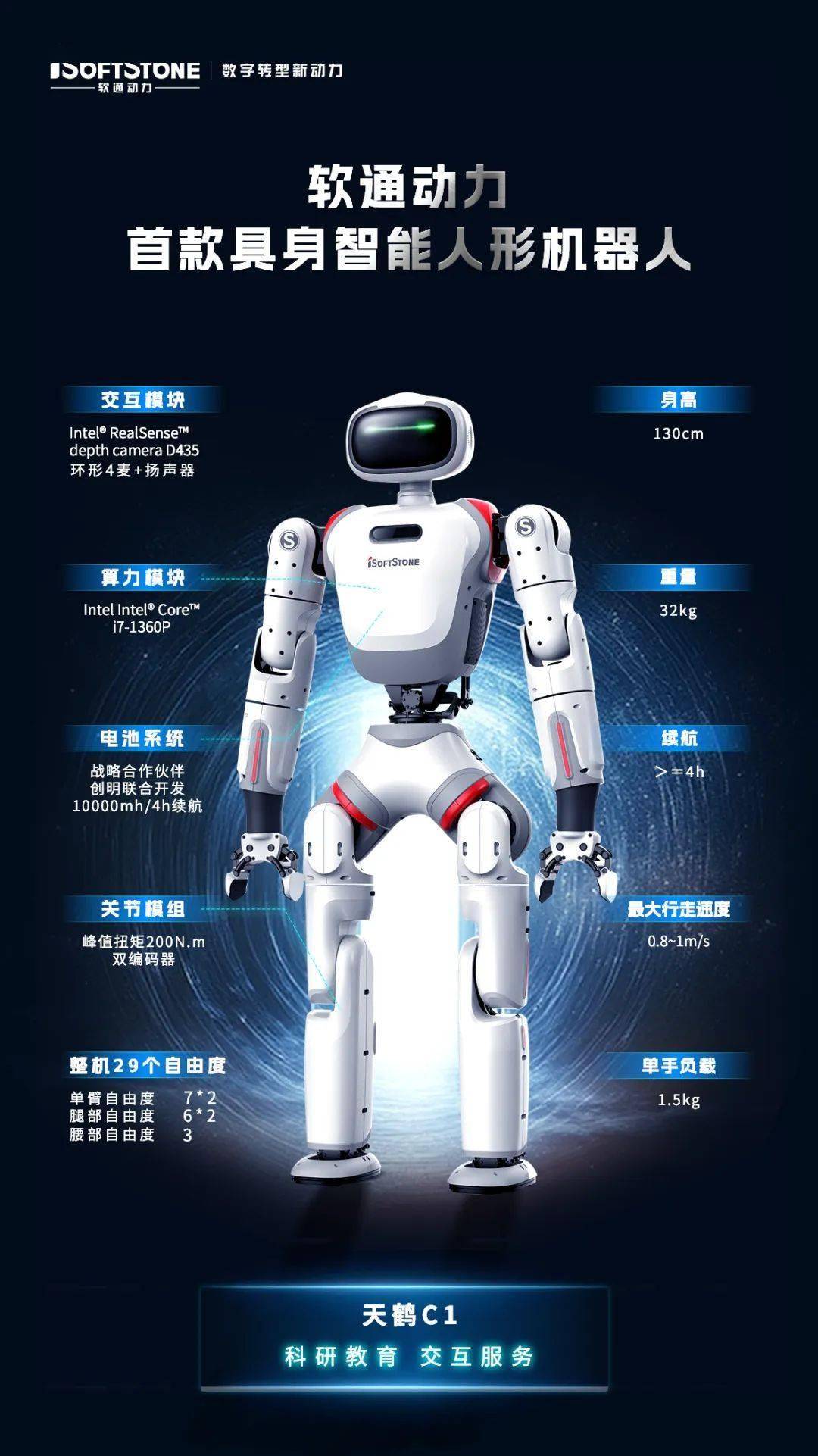 IT之家 1 月 16 日消息,软通天擎机器人公司今日在江苏无锡发布了旗下首款交互与教育双足机器人 —— 天鹤 C1,搭载软通动力自主研发的天璇大模型。 据介绍,天鹤 C1 身高 130cm,重量 32kg,拥有 29 个自由度,搭载多模态感知能力、以及端到端神经网络算法,具备运动与人机交互能力。 围绕交互服务、科研教育场景,天鹤 C1 搭载的星云具身智能计算平台可支持一体化关节、灵巧手、语音视觉感知外设等开放标准 API 访问,提供原子动作算法平台,支持快速接入云上大模型、端侧模型等智能体应用。 软通动力透露,将陆续推出面向柔性制造用工替代的天擎系列、面向通用人形机器人的天锡系列等系列产品,持续布局机器人数据采集、3C / 汽车柔性制造、交互服务等场景,加速人形机器人商业落地。 IT之家注:“江苏软通天擎机器人科技有限公司”于 2024 年 12 月 31 日在无锡成立,是软通动力旗下专注于机器人系列产品设计与研发的子公司。 股东信息显示,该公司由软通动力、无锡智海云鹏咨询管理合伙企业(有限合伙)、无锡软石数智咨询管理合伙企业(有限合伙)、上海智元新创技术有限公司共同持股。 2024 年 7 月,软通动力与上海智元新创技术有限公司在上海签署战略合作协议。双方将在通用机器人产品创新和场景示范等领域展开深度合作,携手推动人形机器人迈向通用。