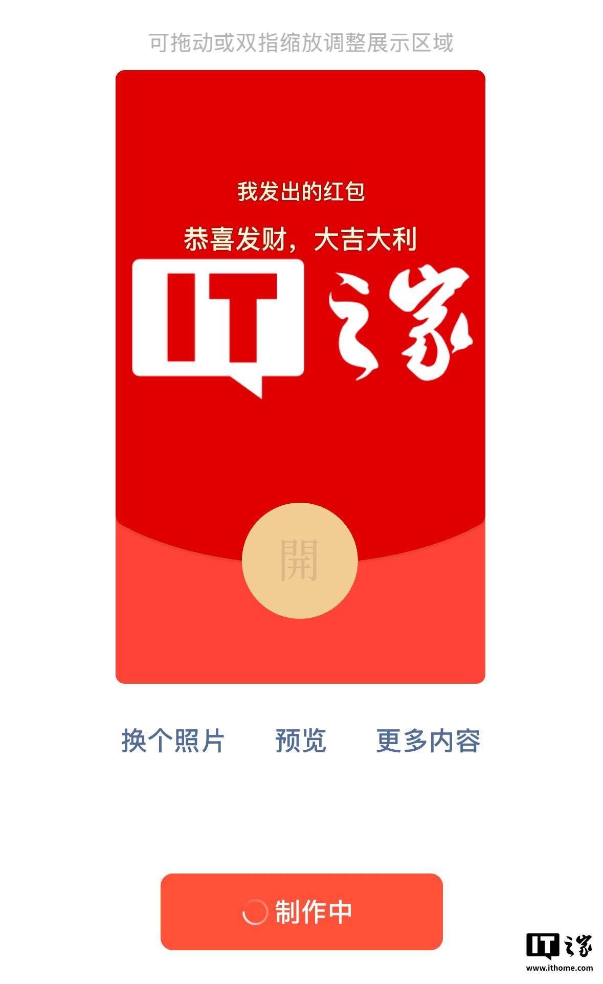 IT之家 1 月 25 日消息,iOS 版微信近期在更新 8.0.55 版本后,开始灰度测试个人发红包自定义封面功能。 微信今日宣布,只要升级到微信最新版本,就可以在发红包时,看到「红包封面」-「制作红包封面」选项,从相册里上传一张照片做封面。 IT之家获悉,该功能支持上传风景、宠物、自拍照,做好的红包封面将和其他领取的品牌封面,一起展示在「我的红包封面」列表中。 除了在发红包时可以做封面,「制作红包封面」还有两个入口。接收到别人发送的“自制封面”红包,可以在打开红包后,画面右上角进入「制作红包封面」。或直接在搜一搜“制作我的红包封面”,都可以使用。