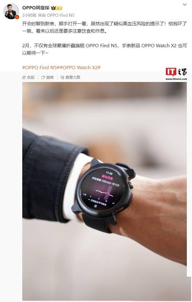 OPPO 今日官宣了 OPPO Watch X2 智能手表,新品将搭载全新钛金属表圈,采用“航空级材质”。该手表即将与 OPPO Find N5 一起登场。 据IT之家此前报道汇总,一款型号为“OWW251”的 TD-LTE 无线数据终端入网图于今年 1 月公布,入网信息显示,这款新品支持独立 eUICC 芯片的 eSIM,eSIM 支持的电信运营商为中国联通和中国移动,电池额定容量为 631mAh。 博主 @数码闲聊站 1 月 3 日曾透露,OPPO Watch X2 系列智能手表为 46mm OLED 圆表,支持 eSIM,采用 ColorOS 全智能系统,电池升级到 631/648mAh+10W 快充,支持 ECG 心电图 + 60 秒健康检查 + 腕温测量 + 运动监测等,GPS / NFC / 高规格防水等都有,ID 大方向不变。 OPPO Find 系列产品负责人周意保曾在 1 月发文透露,OPPO Watch X2 智能手表将支持高血压风险提示,会和 Find N5 折叠屏手机一起在 2 月发布。 周意保分享的图片显示,新款手表将采用圆形表盘设计,右侧分布两枚按键(预计为 1 枚表冠按键和 1 枚多功能按键)。