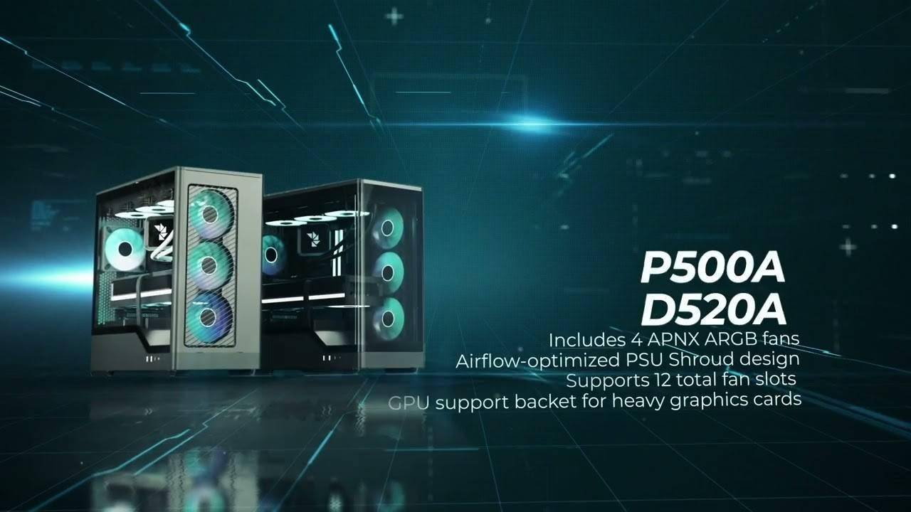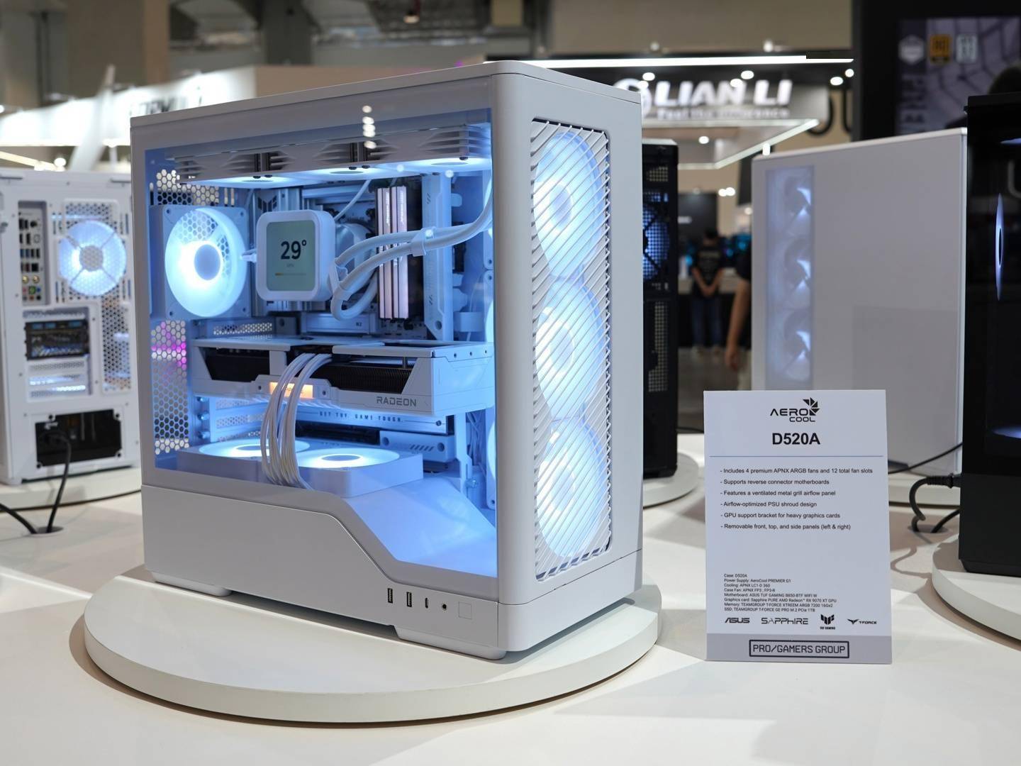 IT之家 6 月 11 日消息,游戏硬件企业 Pro Gamers Group 旗下拥有多个硬件品牌,如老牌键盘制造商 Ducky 吉利鸭、去年诞生的 HAVN 辉帆,此外还包括亲缘关系密切的 AeroCool 和 APNX 两家机电散制造商。 而在上月的 COMPUTEX 2025 台北国际电脑展上,AeroCool 与 APNX 各自带来了多款别有风味的侧透机箱产品。 AeroCool 的 P500A 和 D520A基于相同的设计框架,不同之处 P500A 采用曲面玻璃前面板,而 D520A 在前板靠左位置留有 3 个风扇开孔。 ▲ P500A ▲ D520A 这两款机箱可支持 ATX 主板,配备显卡支架,电源底仓上方的隔板采用倾斜导流设计,更为美观的同时能引导气流吹向发热大户显卡。 AeroCool 的另一机箱新品则是 P500B-DIGI,这一中塔 ATX 全景海景房机箱的前板下部具有一块矩阵灯显区域,可实时显示关键硬件的运行情况。 AeroCool 还带来了 PREMIER G1系列全日系电容 ATX 3.1 全模组电源。该系列产品拥有 80 PLUS 金牌、Cybenetics 白金牌效率认证,1000W 版本也得到了双功率版本的 PPLP 白金牌。 APNX 则是带来了 V2 和 V2-F 这一对全景海景房机箱,其中 V2 系列为前左上三面玻璃的版本,V2-F 则是较为传统的前左两面玻璃。 该机箱拥有独立的主板托盘,APNX 宣称这一 X-pand Flow 设计可分隔电源和主仓硬件的发热,同时这也意味着右侧上方新增了 3 个风扇位。 V2 和 V2-F 机箱支持背插主板,拥有可拆卸的风扇罩和底部滤网,支持最多 13 颗风扇、360 水冷散热器。
