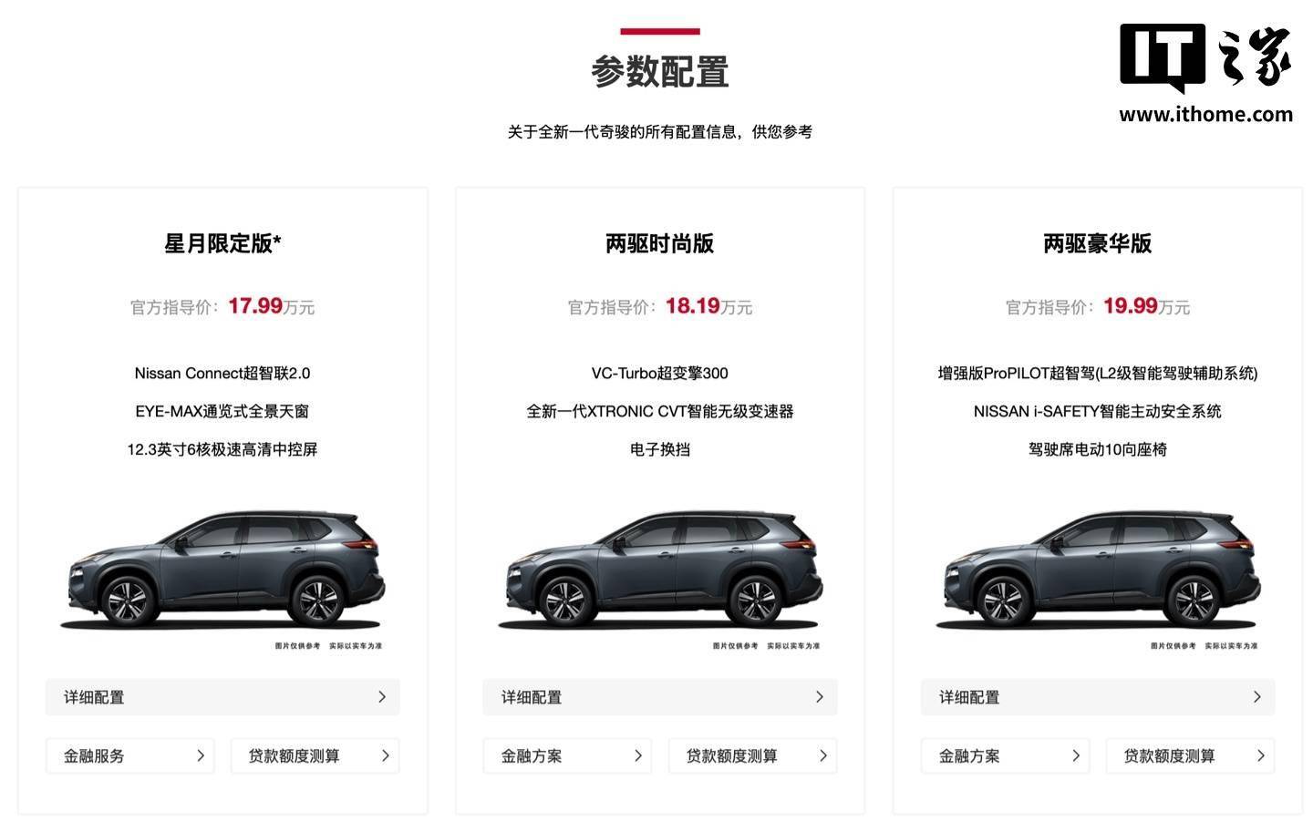IT之家 6 月 13 日消息,东风日产宣布旗下奇骏真心版 SUV 将于下月初上市,作为比较,目前奇骏车型采用新老同堂的销售策略,指导价格为 17.99 万元起。 参考现款车型,系列车型前脸采用大尺寸倒梯形格栅设计,饰以蜂窝状网格及 V 字形镀铬饰条,车身匹配传统造型门把手,车尾提供大型扰流板,采用隐藏式排气设计。 内饰方面,系列在售车型悬浮式中控,提供三辐式方向盘,拥有手机无线充电、胎压显示、前后驻车雷达、360 度全景影像、全速自适应巡航等配置。 规格方面,IT之家获悉系列在售车型长宽高分别为 4681x1840x1730(1725)毫米,轴距为 2706 毫米,奇骏可选 1.5T 发动机和 e-POWER 超混电驱两种动力系统,其中 1.5T 发动机最大功率为 150 千瓦,传动系统匹配 CVT 无级变速箱;e-POWER 超混电驱系统由 1.5T 发动机和双电机组成。