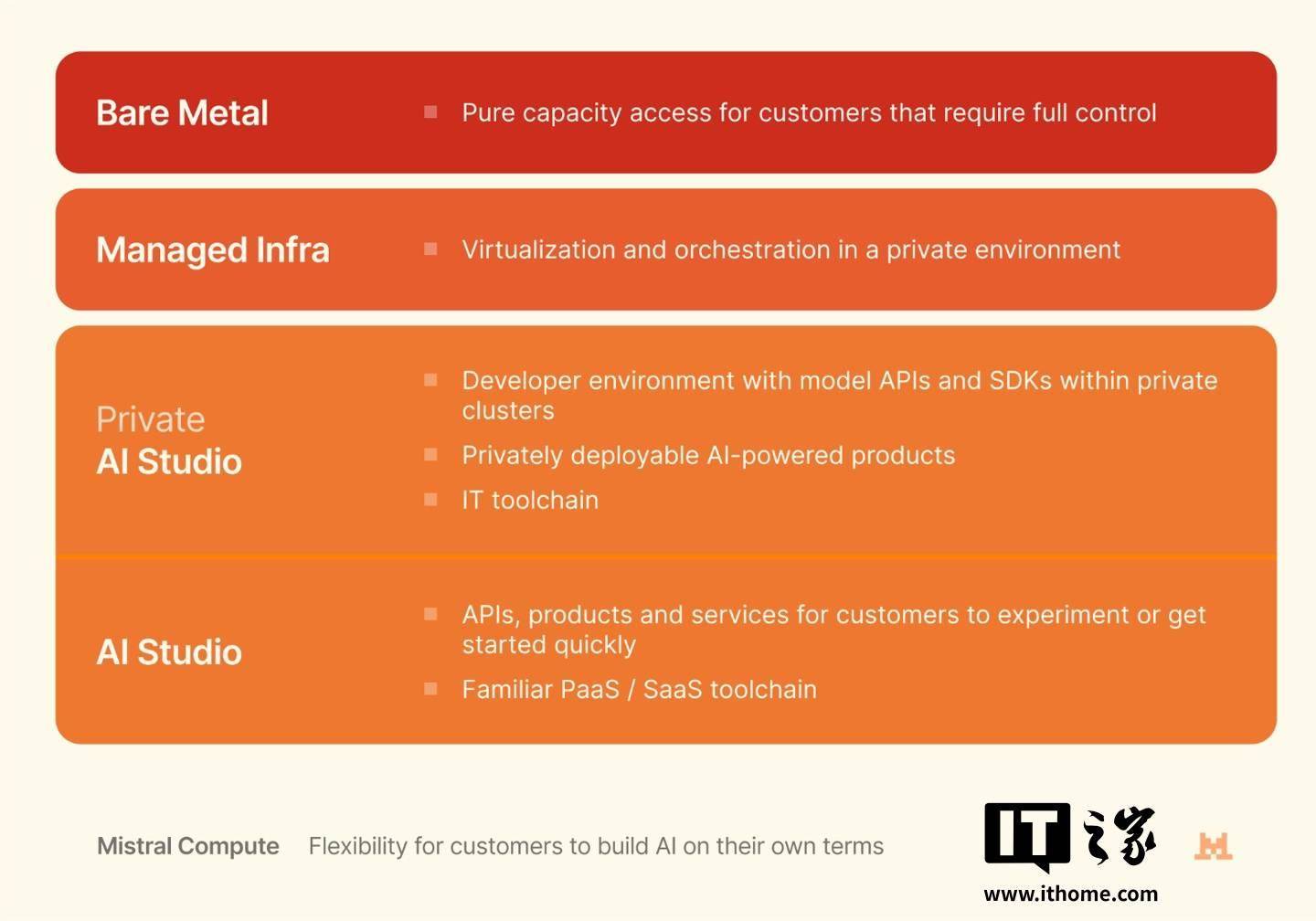 Mistral AI 宣布在欧洲市场推出一项名为 Mistral Compute 的 AI 云平台,正式进军 AI 基础设施市场,与微软 Azure、亚马逊 AWS、阿里云等平台进行竞争。 据介绍,Mistral Compute 是 Mistral 与英伟达合作构建的一套完整 AI 云平台,据称平台底层应用了数万颗英伟达 GPU,平台的核心则是基于 Mistral 自家训练工具包,提供涵盖 GPU、协同计算层、API、产品与服务在内的整合式私有 AI 技术栈,满足企业从基础裸机到全托管 PaaS 平台的不同层级需求。 Mistral AI 表示,目前 Mistral Compute 平台已与多家技术与行业合作伙伴建立合作,涉及法国电商 SaaS 企业 Mirakl、法国电信运营商 Orange、施耐德电气(Schneider Electric)等企业。尽管当下 Mistral Compute 的服务仅覆盖欧洲市场,但该公司计划将平台扩展至中东、亚洲等地区。