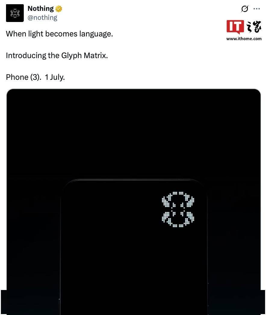 此前消息显示,该机将提供黑白双色可选,搭载高通骁龙 8s Gen 4 处理器,可选“12GB RAM + 256GB 存储空间”及“16GB RAM + 512GB 存储空间”两种配置,起售价为 850 欧元(IT之家注:现汇率约合 6948 元人民币)。 该机背面将配备 Glyph Matrix 数显矩阵屏,有点类似华硕 ROG 游戏手机背面的“光显矩阵屏”,也就是在手机背板上引入 LED 灯珠矩阵,但 Nothing Phone(3)配备的相应屏幕面积似乎较小,仅位于手机一侧。