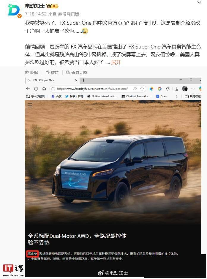 IT之家 7 月 20 日消息,在 7 月 18 日的发布会上,法拉第未来创始人、联席 CEO 贾跃亭宣布推出 FX 品牌首款纯电动中大型 MPV 车型 ——Super One,并公布了 FF EAI 具身智能体 6×4 技术架构。 法拉第未来 Super One 有着传统 MPV 的身形,但前脸中网部分并未采用散热格栅设计,而是一整块 LED 显示屏,FF 称之为“Super EAI F.A.C.E.设计”,其中 F.A.C.E是指 Front AI Communication Ecosystem。法拉第未来并未公布其价格,只表示 FX Super One 的定价将“偏高”,但同时又表示这款车将是一款“价格亲民的大众市场 MPV”,外媒猜测会低于 8 万美元(IT之家注:现汇率约合 57.4 万元人民币)。 但据网友 / 博主反馈,该车改装自长城魏牌高山 9。同时法拉第未来官网曾显示有原型车相关介绍,其中写明高山 9(截至发稿,相关描述已删除)。 作为参考,长城魏牌全新高山 MPV 在今年 5 月 13 日正式上市,共推出 3 款不同尺寸车型,分别命名为高山 7、高山 8、高山 9。其中高山 9 售价 35.38 万元,长宽高分别为 5410/1960/1890 毫米,轴距 3275 毫米,采用 6 座布局,搭载 Coffee OS 3.0 系统以及高通骁龙 8295P 座舱芯片,副仪表台配备有手机无线充电面板、储物格等。方向盘为双辐式设计,并应用了怀挡式换挡机构。 魏牌全新高山系列全系搭载了长城第三代智能驾驶系统 Coffee Pilot Ultra,支持城市领航、高速领航以及点到点领航等智驾功能。全车搭载 27 个传感器,包括 2 个前视 800 万像素摄像头、1 个 128 线激光雷达、3 个毫米波雷达、12 个超声波雷达、4 个环视摄像头、4 个侧视摄像头和 1 个后视摄像头,配备单颗英伟达 Orin X 芯片。 动力系统上,魏牌全新高山系列全系搭载 Hi4 性能版动力系统,由 1.5T 发动机、4 挡 DHT 变速箱以及前后轴双电机组成,系统综合输出功率达到 337 千瓦,综合扭矩为 644 牛・米,0-100 公里 / 小时加速时间仅需 5.7 秒。高山 9 搭载容量为 51.55 千瓦时的电池组,WLTC 工况纯电续航里程为 201 公里。