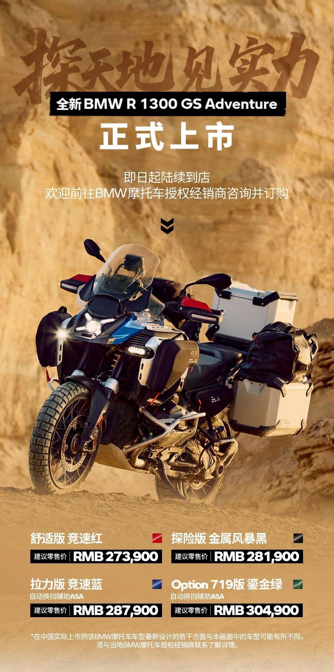 宝马摩托车中国今日宣布,全新 BMW R 1300 GSA 正式上市,首发提供四款车型可选,IT之家汇总如下: - 舒适版(竞速红):27.39 万元