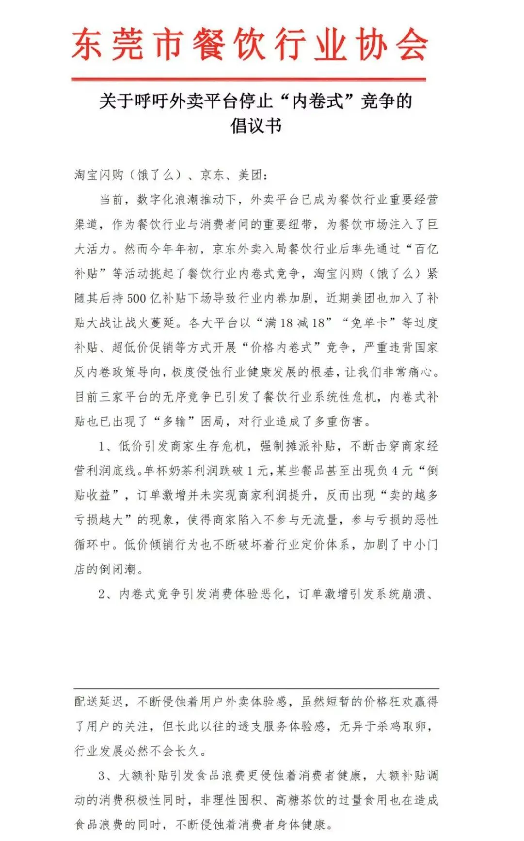 1个月后,即外卖大战愈演愈烈时,遵义市红花岗区餐饮行业商会发布《关于呼吁外卖平台停止“内卷式”补贴和不正当竞争的倡议书》,湖北省、陕西省、云南省等省份及青岛、大连、大同等城市的餐饮行业协会亦陆续发布相关倡议书。