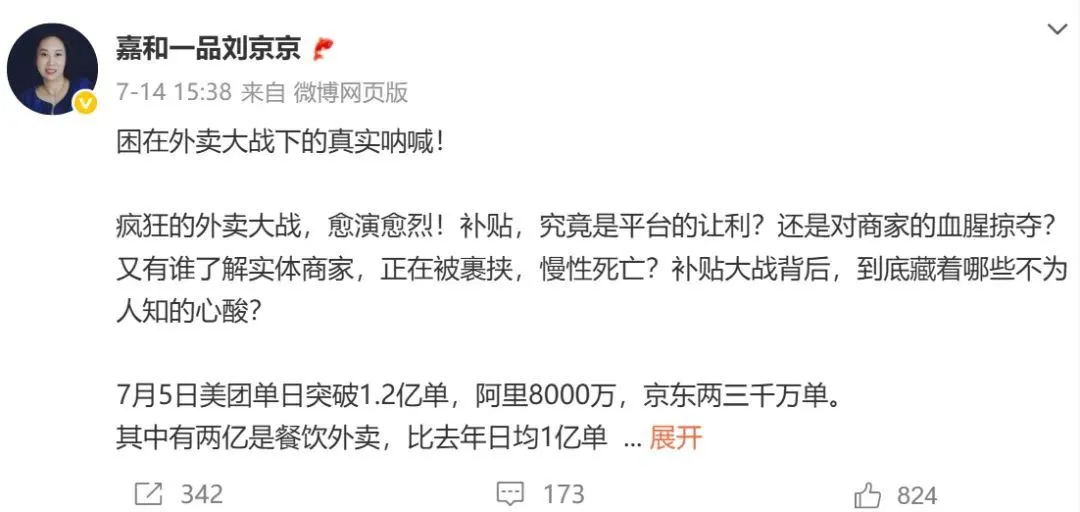 在外卖大战中,中小商家最为承压,大品牌也叫苦不迭。此前拥有超过百家门店的餐饮品牌嘉和一品创始人、董事长刘京京,近日在微博上发布了“困在外卖大战下的真实呐喊”,称外卖订单量骤增是依靠补贴抢夺堂食订单,商家被裹挟,赔本赚吆喝,结局很可能是“慢性死亡”。