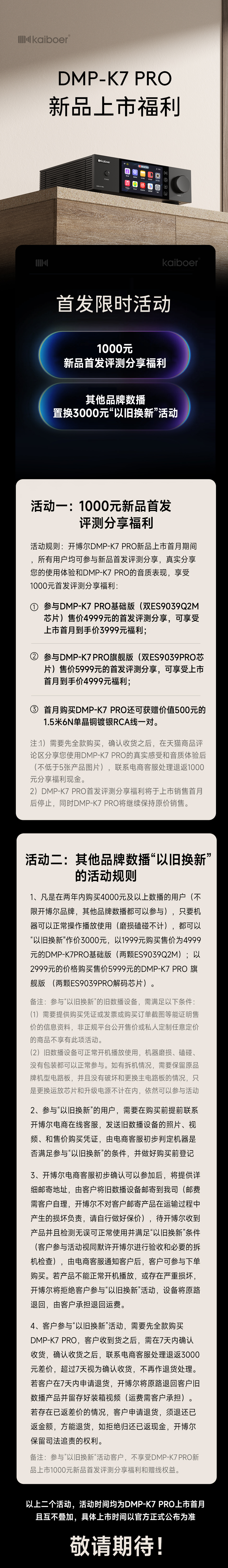 首月购入DMP-K7 PRO用户可尊享惊喜限时评测奖励,详情请咨询开博尔京东/天猫旗舰店客服。