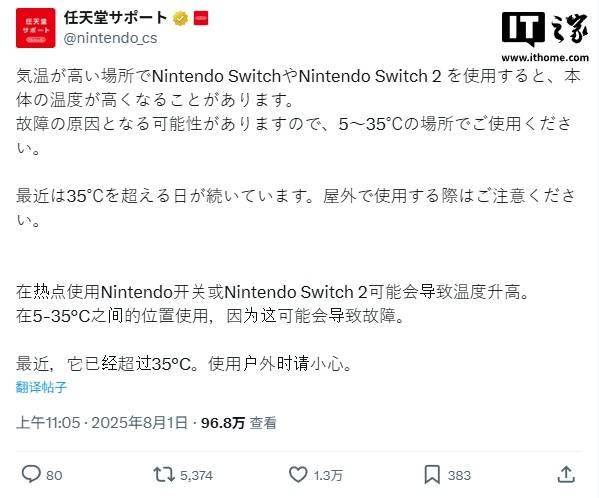 任天堂官方周五发文,提醒 Switch 和 Switch 2 玩家应避免在高温环境下使用,因为在 5-35°C 之外的环境中使用可能会导致设备故障。 任天堂表示,日本多地气温已飙升至 35℃以上,超过了设备推荐的使用温度阈值。鉴于北半球其他地区也出现了类似高温,所有玩家都应注意 Switch 2 是否存在过热问题。 与原版 Switch 类似,任天堂 Switch 2 在检测到过热时会先显示警告信息,随后进入睡眠模式。 除户外阳光直射下的使用场景外,Switch 2 在主机模式下性能释放也会比掌机模式更强。另外,Switch 2 底座虽内置风扇,但却仅能用于底座本身的散热,所以也有部分玩家选择搭配散热背夹使用。 截至目前,IT之家暂时没有看到关于 Switch 2 因过热而“变砖”的报道,但有证据显示过热环境可能导致电池膨胀。 任天堂还指出,低于 5℃的低温环境也会对 Switch 2 造成伤害,极端寒冷可能导致敏感组件和塑料部件受损。