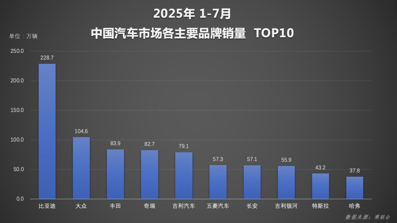 稳居双冠王,累计同比增长超 27% 官方数据显示,比亚迪 2025 年 1-7 月累计销量达 249 万辆,同比增长超 27%,继续引领新能源汽车高速增长,在车市下半场开局就展现出强劲的增长韧性。 在新能源汽车领域,比亚迪的优势尤为突出。在 1-7 月重点汽车集团新能源汽车销量前十中,比亚迪独占鳌头,销量甚至超过了第二、三、四名销量之和,再次印证了其在新能源赛道的绝对实力。 其中,比亚迪汽车王朝丨海洋 1-7 月累计销售 228.7 万辆,同样以绝对优势拿下中国汽车市场各主要品牌 1-7 月销量榜首,主力车型销量稳居市场前列,领先地位不可撼动。 技术为基,推动销量再突破 2025 年,比亚迪以“技术开年”,接连推出多项行业领先的重磅技术及产品,为销量增长注入核心动力。“天神之眼”辅助驾驶系统 2 月发布至今,搭载车型超过 120 万辆,平均每天生成辅助驾驶数据超 7200 万公里。在 7 月销量中,比亚迪辅助驾驶车型国内占比已达到 87%,用实力诠释智能化下半场的“比亚迪速度”。不仅如此,比亚迪还率先承诺为智能泊车场景的安全及损失“全面兜底”,这不只体现了企业对消费者负责到底的态度,同时也是比亚迪对天神之眼技术的强大自信。 此外,灵鸢车载无人机系统、首创兆瓦闪充技术的超级 e 平台等创新成果的落地,进一步拓宽了比亚迪的技术护城河。超级 e 平台受到市场持续追捧,首搭车型汉 L、唐 L 持续热卖。技术实力的不断突破,让比亚迪在激烈的市场竞争中始终占据主动。 全矩阵发力,高端与海外市场齐飘红 主力车型持续热销的同时,比亚迪高端品牌阵营也实现快速崛起。2025 年 1-7 月,方程豹、腾势、仰望三大高端品牌累计销量达 16.7 万辆,较去年同期增长超 75%,在高端市场的话语权持续提升。 海外市场方面同样迎来爆发式增长,1-7 月乘用车及皮卡海外销量超 55 万辆,同比增长超 130%,成为同期乘用车出口增量最多的车企。其中,宋 PLUS、海狮 07EV、元 PLUS、海鸥等明星车型在全球市场持续热销。 在海外销量持续大幅增长的同时,比亚迪的全球化布局继续提速。7 月,巴西工厂首车下线、泰国第 9 万辆新能源汽车交付,出海里程碑不断刷新。 实力加冕,稳居全球行业第一梯队 7 月底,2025 年《财富》世界 500 强榜单发布,比亚迪不仅连续 4 年上榜,并较 2024 年前进 52 名,位列第 91 位,首次迈入全球前百行列,进一步印证了企业综合实力的持续跃升。 从技术创新到产品矩阵完善,从国内领跑至全球扩张,比亚迪已构建起“技术 + 产品 + 全球化”的多维增长引擎。进入下半场,比亚迪将在新能源汽车赛道上持续领跑,为全球用户带来更优质的绿色出行体验,书写汽车产业变革的新篇章。(IT之家)