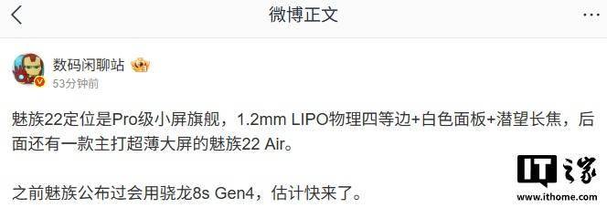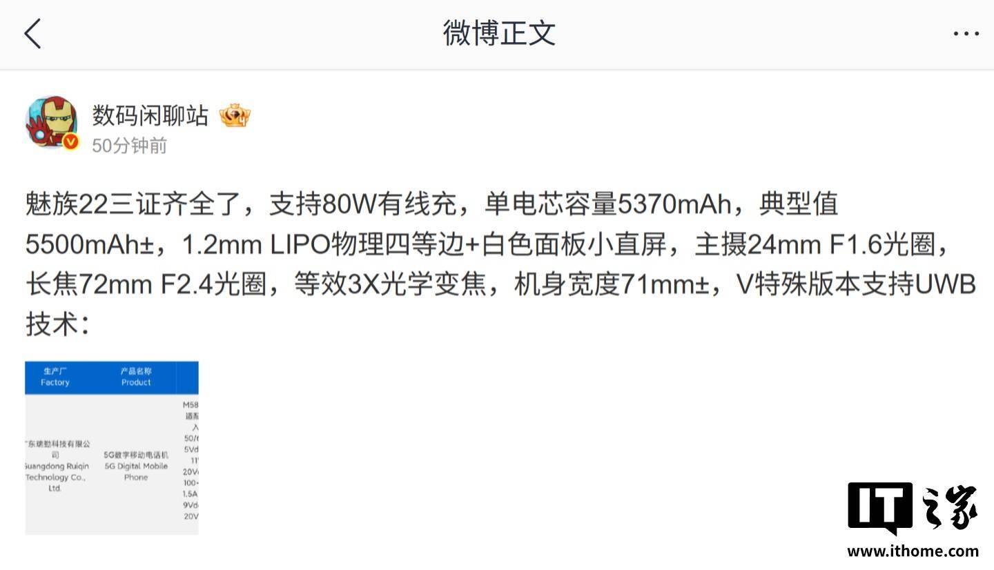 数码闲聊站 今天在微博透露,魅族 22 手机现已三证齐全,支持 80W 有线充。 据博主所述,这台手机的单电芯容量是 5370mAh,典型值为 5500mAh±,具备“1.2mm LIPO 物理四等边 + 白色面板”小直屏,机身宽度 71mm±,“V 特殊版本”还支持 UWB(IT之家注:超宽带)技术。 星纪魅族集团 CEO 黄质潘昨天爆料,这台手机的后摄阵容是主摄 24mm f/1.6、长焦 72mm f/2.4,具备等效 3 倍光学变焦的特性。 博主此前曾表示,魅族已公布的新机会采用骁龙 8s Gen4 处理器,估计快来了。但博主并没有明说这款 8s Gen4 芯片魅族新机的具体型号,需要等待官方确认。 工信部电信设备进网许可网页显示,魅族有两款 5G 数字移动电话机在 8 月 12 日获进网许可,型号分别为 M582Q、M582V,@数码闲聊站 此前表示 M582Q 可能是魅族 22 的小屏版。 同时星纪魅族集团中国区 CMO 万志强曾表示,魅族 22 手机的屏幕比例“不是遥控器”,此前魅族曾表示这款手机定位“AI 时代小屏旗舰”,号称“挑战最佳小屏握持手感”。