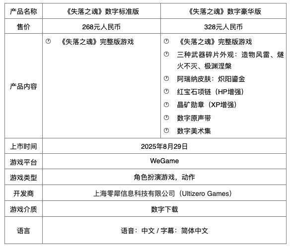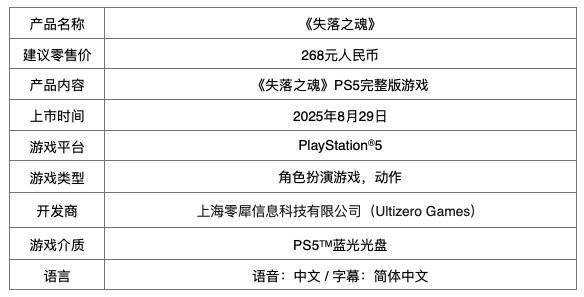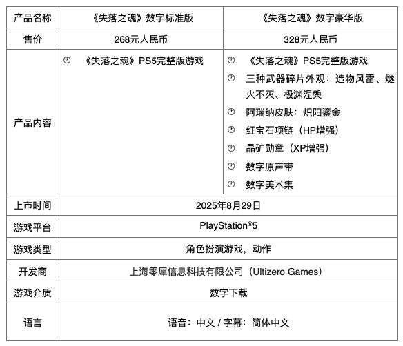 “中国之星计划”游戏《失落之魂》8 月 29 日全球同步登陆 PS5 和 PC。上市版本包括 PlayStation 5 数字标准版、数字豪华版,PlayStation 5 国行光盘版,WeGame 数字标准版和数字豪华版。 - PlayStation 5 数字标准版游戏建议零售价为 268 元,数字豪华版建议零售价为 328 元,国行光盘版建议零售价为 268 元;