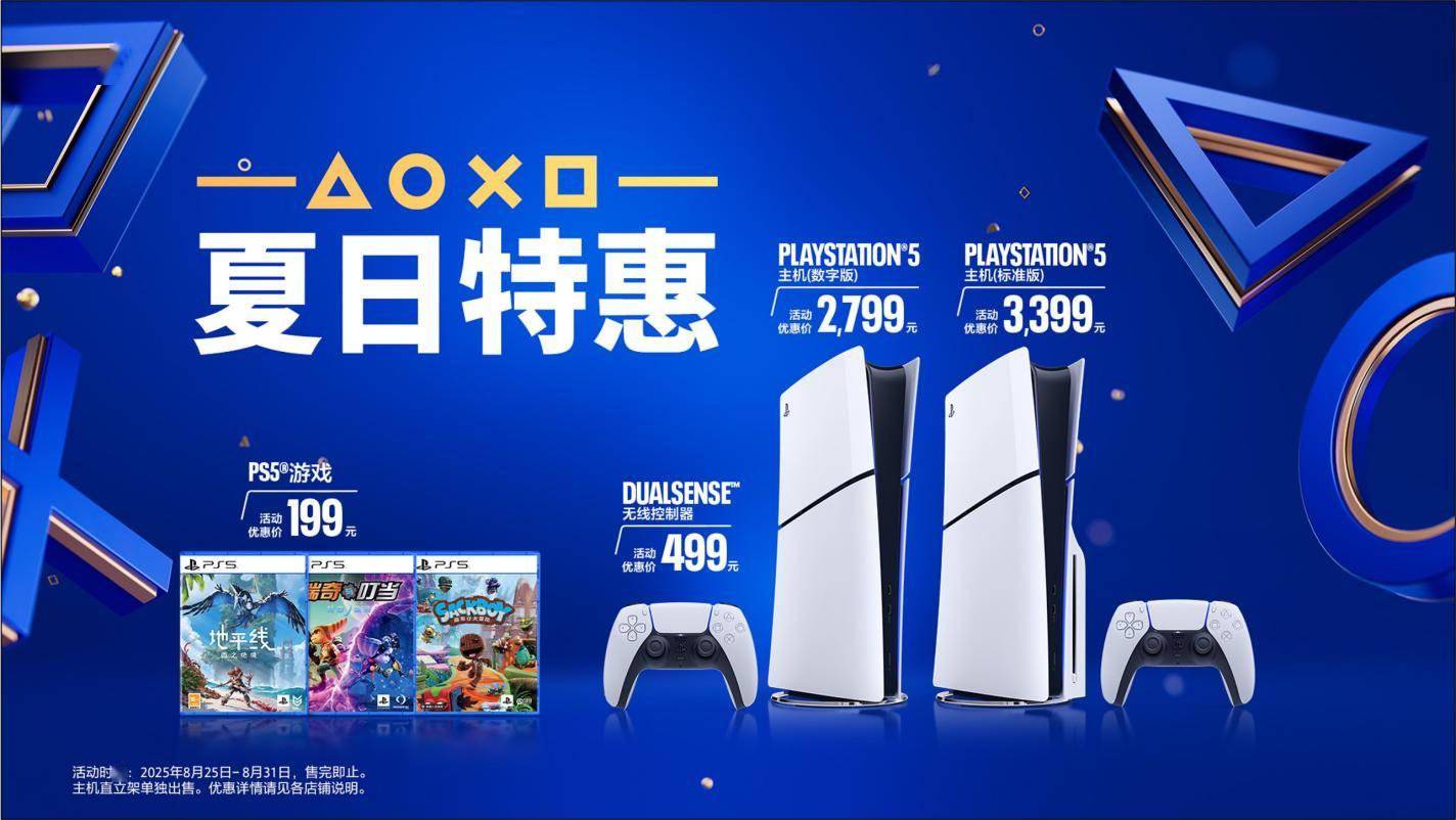 据 PlayStation 中国官微,PlayStation 品牌夏日特惠将于8 月 20 日至 8 月 25 日在天猫及抖音 PlayStation 官方旗舰店、PlayStation 京东自营旗舰店同步开启预热,并于 8 月 25 日至 8 月 31 日进行现货销售。 IT之家汇总具体优惠情况如下: - PlayStation 5 主机(CFI-2000 型号组-轻薄版)标准版优惠价 3399 元;