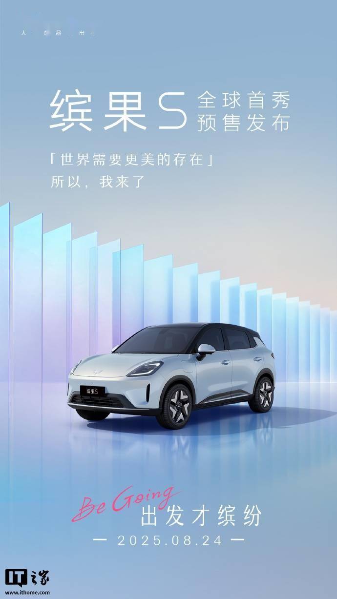 五菱汽车今日宣布缤果 S 全球首秀暨预售发布会将于 8 月 24 日举行。新车定位纯电小型 SUV,是缤果家族的第三款车型,定位预计在缤果 PLUS 之上。新车采用单电机前驱,最高续航 430km,并将于三季度内正式上市。 IT之家注意到,外观方面,缤果 S 前脸采用封闭式造型,搭配梯形散热开口和纵向通风口。大灯组采用四边形圆角设计,进一步增强了车辆的时尚感。车身侧面采用双拼色设计,搭配宽厚的黑色轮眉和低风阻 16 英寸轮圈。新车提供松弛灰、自在蓝、逍遥紫和放空白四种外观颜色供消费者选择。 车尾部分,缤果 S 配备了车顶扰流板和高位刹车灯组,尾灯采用贯穿式设计,并在两侧形成独特的回勾样式。后包围的内凹式牌照框和银色装饰条则让车尾更具层次感。车身尺寸方面,缤果 S 的长宽高分别为 4265/1785/1600 毫米,轴距为 2610 毫米。 内饰方面,缤果 S 以“静奢栖居美学”为核心设计理念,配备了内嵌式的 8.8 英寸全液晶仪表盘和双色三辐式多功能方向盘。中控台中间搭载了悬浮式的 12.8 英寸触控屏,并配备了贯穿式的空调出风口面板装饰。中控台通道区域配备了无线充电面板、手机卡槽和双杯架设计。 新车采用环抱式座舱布局,提供柔白与暖棕双色内饰,搭配 3D 质感木纹工艺和大面积软质皮质包覆,以及高亮镀铬装饰,营造出豪华舒适的驾乘环境。储物空间方面,车内提供了 25 处储物空间,包括魔术挂钩和一体式门把手储物格。后备厢采用下沉式设计,后排放倒后容积可拓展至 1450 升。 动力方面,缤果 S 搭载最大功率 75 千瓦的前置电机,并配备 31.9kWh 和 41.9kWh 的磷酸铁锂电池组。在 CLTC 工况下,纯电续航里程分别为 325 公里和 430 公里。