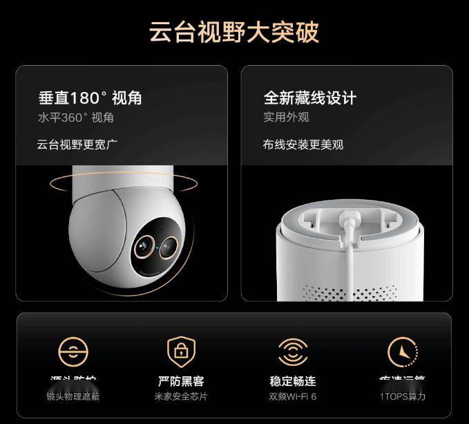 据IT之家了解,小米智能摄像机 4 变焦版内置米家安全芯片,获得国家 EAL 5 + 认证,确保数据传输经过金融级别保护,隐私安全有保障。摄像机还具备源头防止拍摄、通讯隐私保护和运算不经云端等多重隐私保护措施。 摄像机采用全新藏线式设计,隐藏式 Type-C 接口,告别杂乱布线。创新云台结构设计,打造小米首款垂直 180° 视角室内摄像机,可视范围全面拓宽。