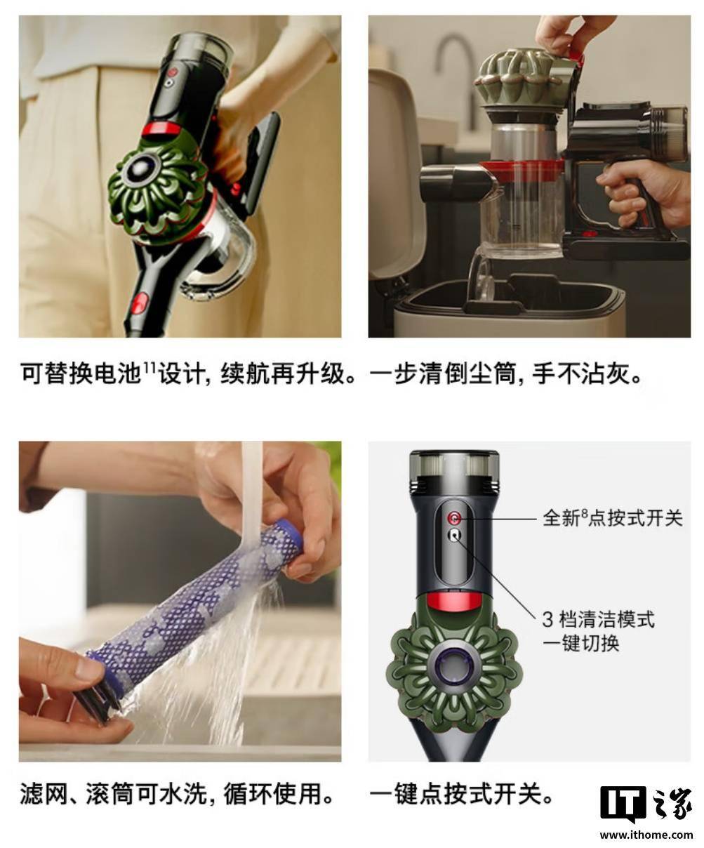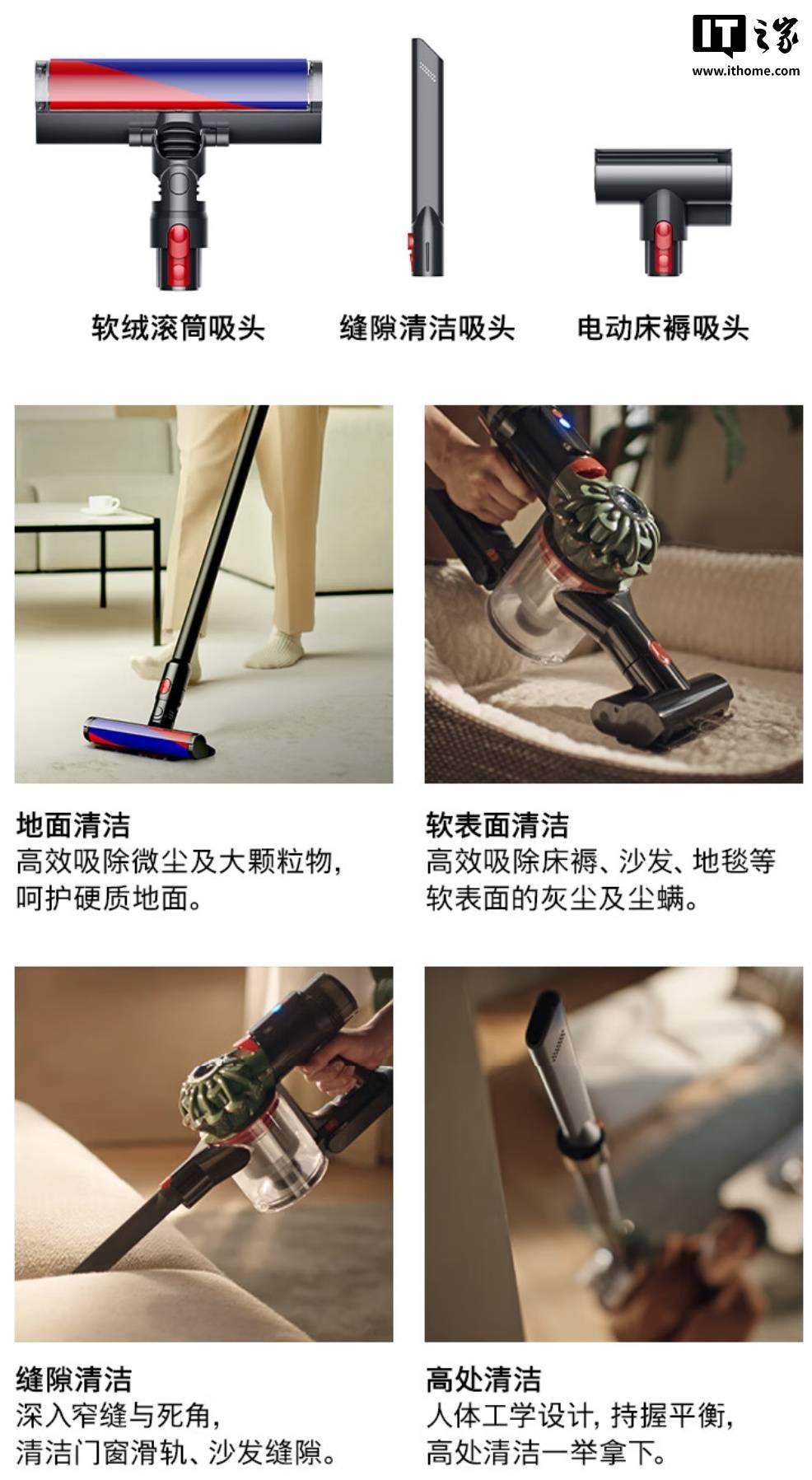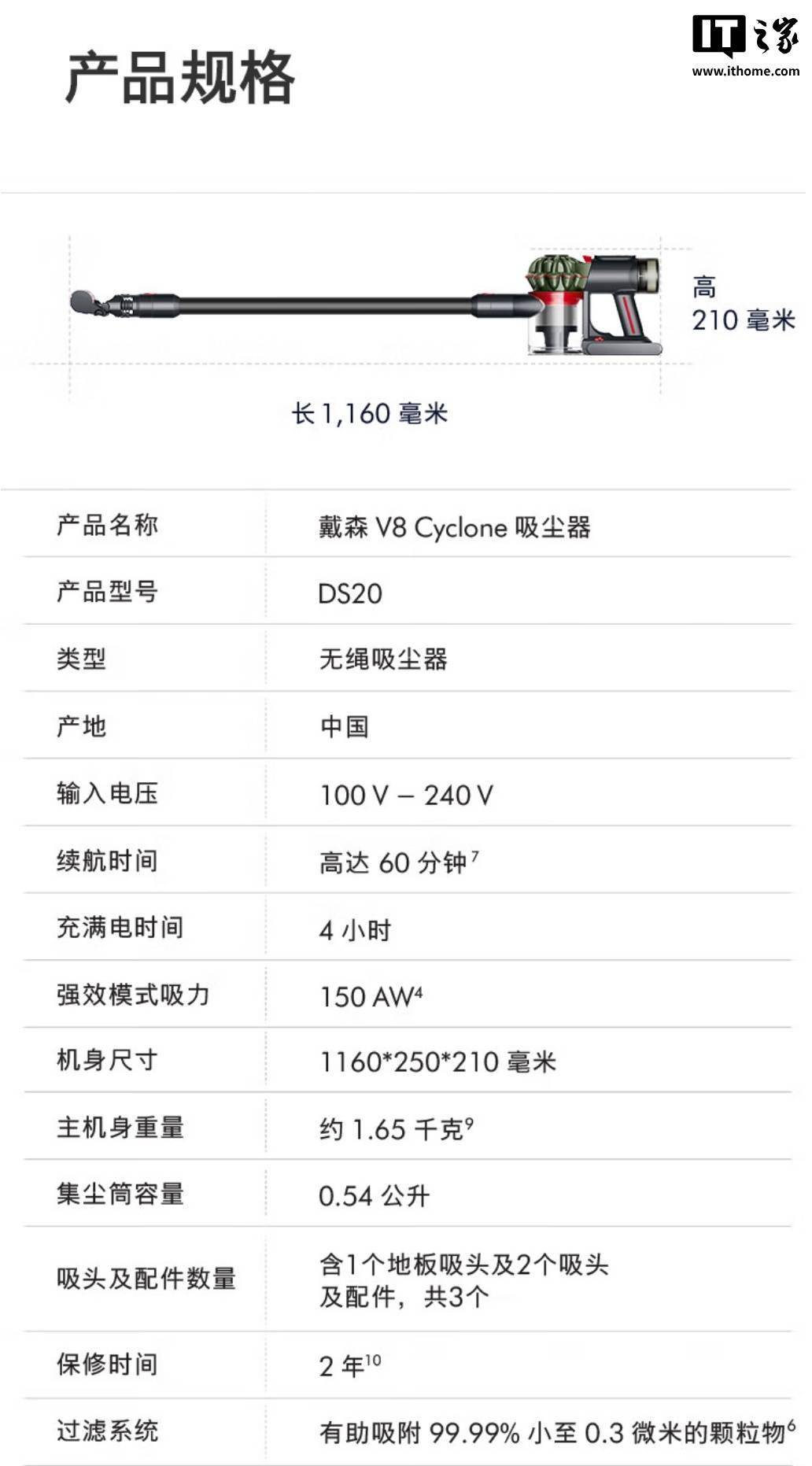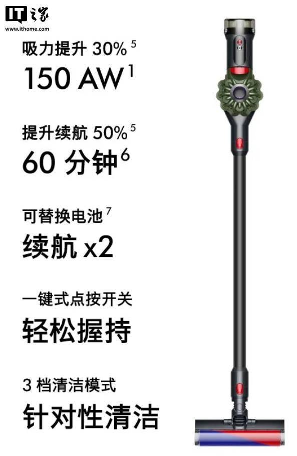 IT之家 8 月 22 日消息,戴森全新 V8 Cyclone 旗舰版吸尘器今日正式上市,定价 2999 元,国补后 2549.15 元起。 该吸尘器支持 150AW 吸力(升级到 11 万转 / 分钟马达),续航 60 分钟,可替换电池,支持 3 档清洁模式。 戴森 V8 Cyclone 采用了双层 15 锥气旋技术,保持气道通畅;还进行整机密封,可过滤 99.99% 小至 0.3 微米的颗粒物,避免二次污染。 该吸尘器配有多种吸头,可吸地面、床褥、汽车内饰等,滤网滚筒可水洗,采用一键点按式开关。 戴森全新 V8 Cyclone 旗舰版吸尘器今日正式上市,定价 2999 元,国补后 2549.15 元起,IT之家附参数表如下: