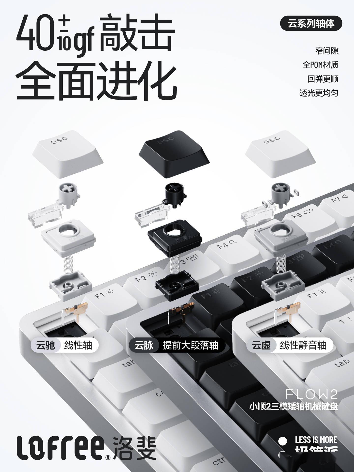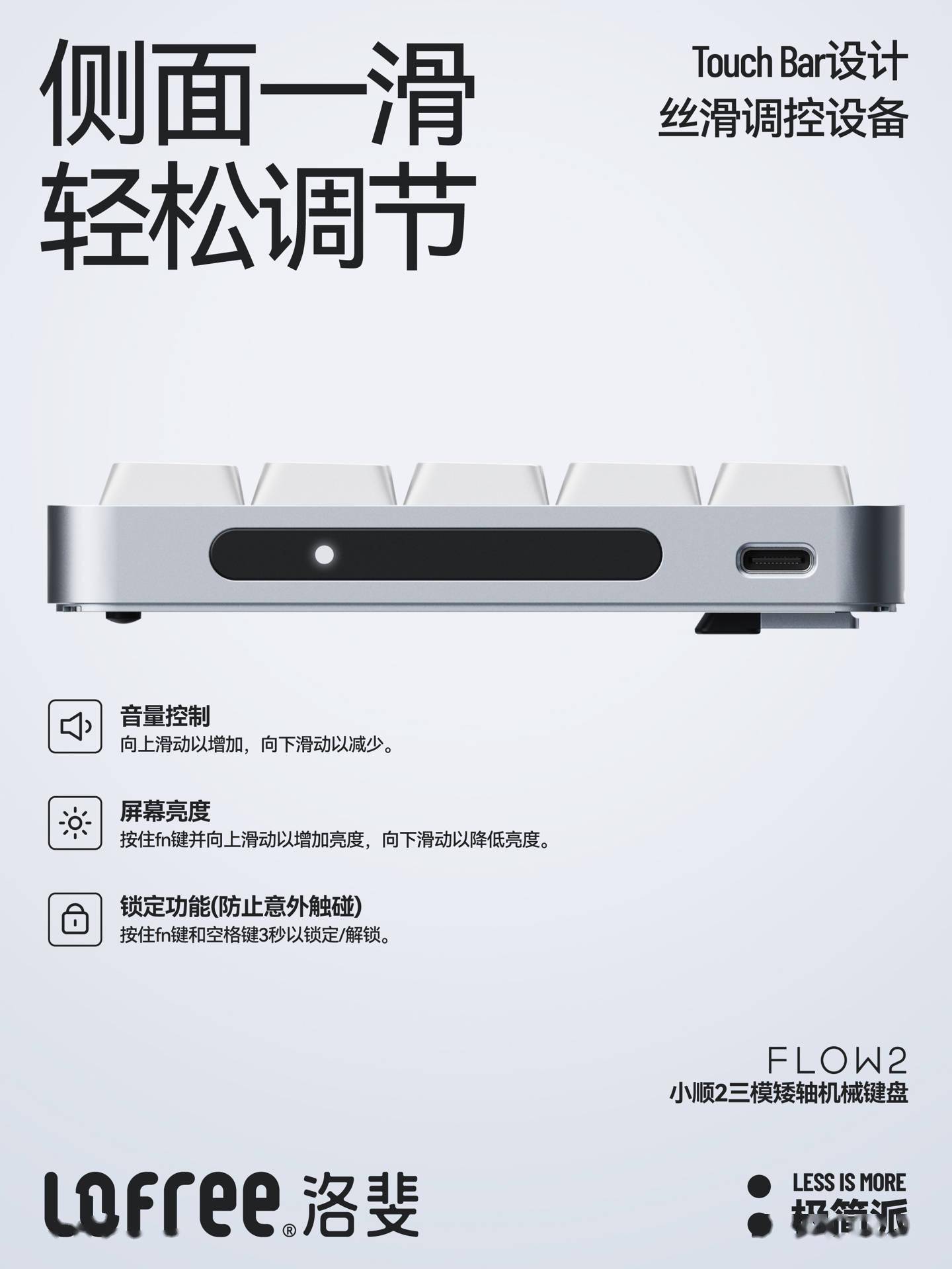 IT之家 8 月 25 日消息,洛斐 Lofree 今日宣布小顺 2 (Flow 2) 三模矮轴机械键盘在国内市场上市。该键盘的最大特色无疑是右侧的 Touch Bar 调控区结构。 洛斐小顺 2 键盘采用极简主义外观设计,外壳为阳极氧化喷砂 CNC 铝合金,内部以 Gasket 垫片固定,具备多层填充材料,支持 VIA 开源改键。其配备 PBT+PC 双色注塑键帽和云系列 40gf 矮轴,可选线性“云驰”、提前大段落“云脉”、线性静音“云虚”版本。 该键盘支持有线 USB-C、无线 2.4GHz、无线蓝牙三模连接,轮询率可达 1000Hz,支持 Windows 和 MacOS 操作系统“秒切”,适配台式机、笔记本、iPad 平板电脑和智能手机设备。 而在右侧方,该 Touch Bar 结构支持音量和屏幕亮度调节并可锁定防误触,与其它键盘上的多媒体旋钮起到类似作用。 值得注意的是,由于小顺 2 采用的是右出线 + 右侧 Touch Bar 结构,这意味着这款键盘在有线模式下与常规的键盘在左鼠标在右布局不太适配,更适合左手使用鼠标或以触控板替代鼠标输入的用户。 洛斐小顺 2 三模矮轴机械键盘可选 68 键 / 84 键 / 100 键三种配列,基础款价格分别为 599 元 / 799 元 / 899 元,云虚轴款要再贵上 100 元。