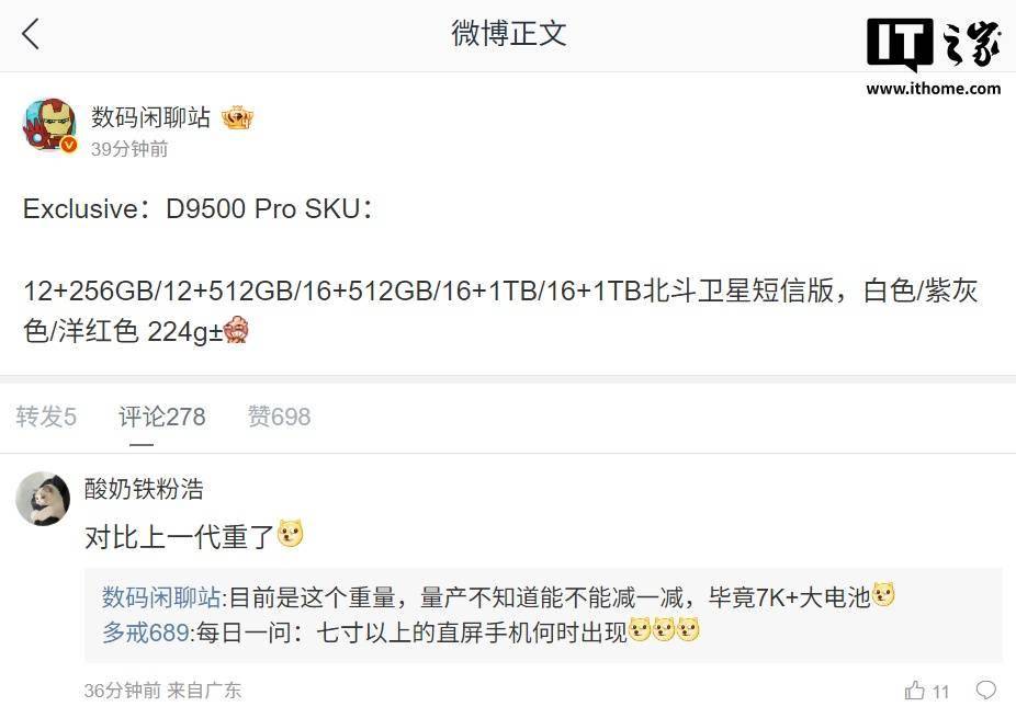 爆料还称该机可选白色 / 紫灰色 / 洋红色,机身重量 224g±。 根据该博主暗示和评论区猜测,爆料机型预计为 OPPO Find X9 Pro。 作为对比,OPPO Find X8 Pro 的机身重量约 215g,因此新一代要更重一些。该博主对此表示:“目前是这个重量,量产不知道能不能减一减,毕竟 7K + 大电池。” ▲ OPPO Find X8 Pro 星野黑 | 漫步云端 | 晴空航线 根据 Smartprix 联合 @Yogesh Brar 此前放出的 OPPO Find X9 Pro 配置信息,OPPO Find X9 Pro 将配备一块 6.78 英寸的 1.5K 120Hz OLED 直屏。 影像方面,与前代的四摄方案不同,Find X9 Pro 被曝改为三摄配置: - 5000 万像素索尼 LYT-828 主摄