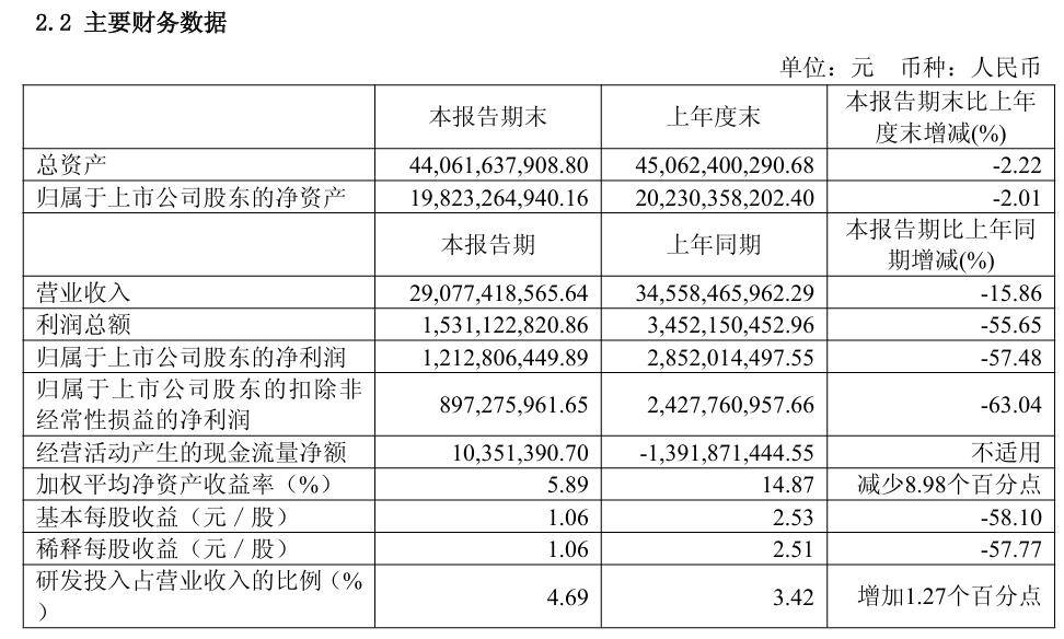 - 归属于母公司所有者的净利润 12.13 亿元,较上年同期下降 57.48%;