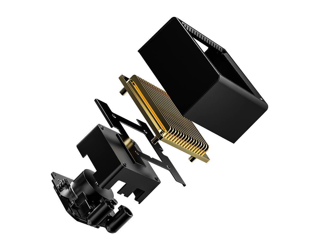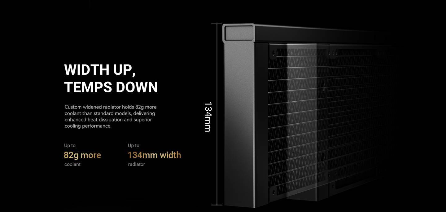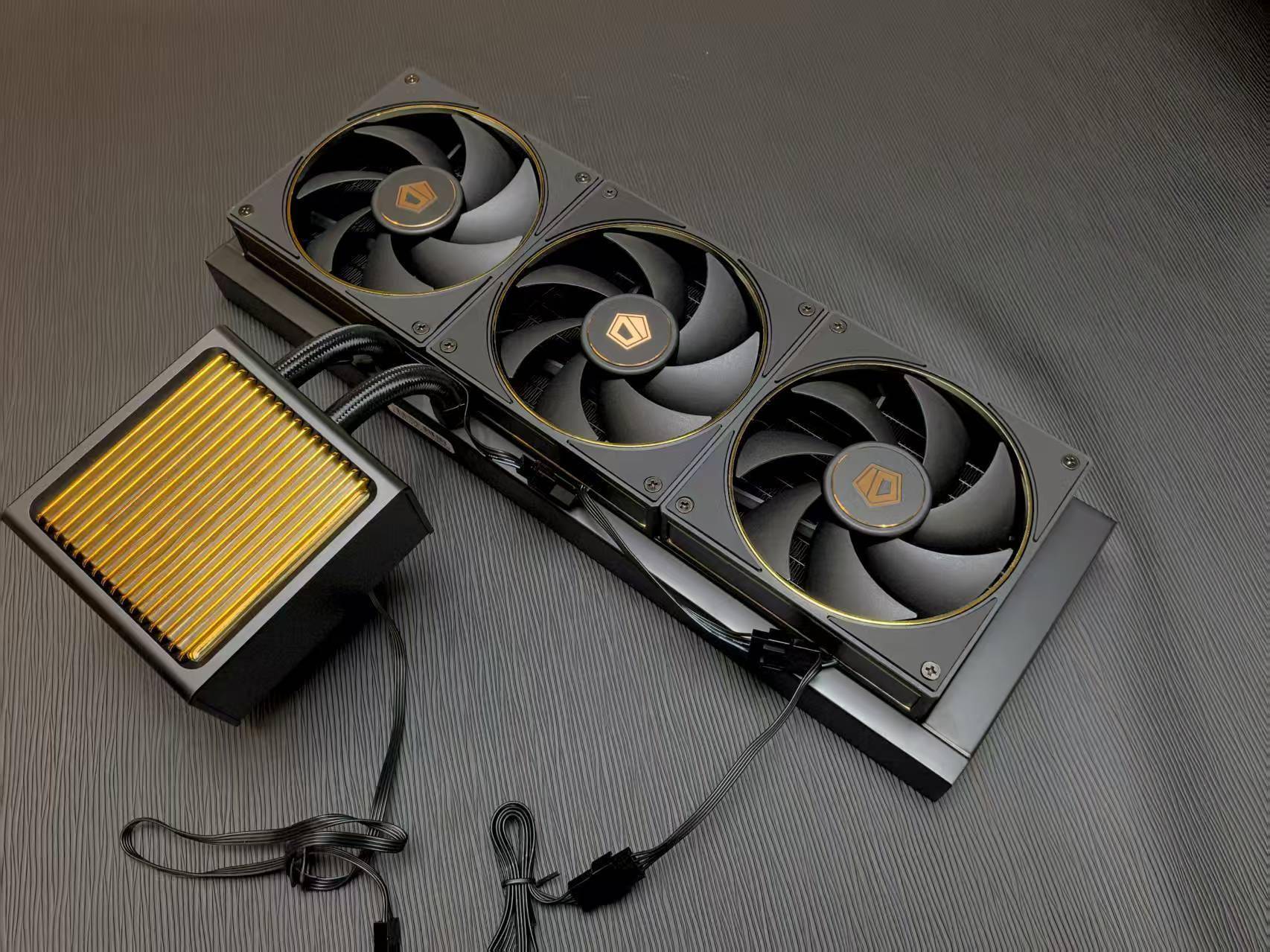 IT之家 9 月 2 日消息,酷凛 ID-COOLING 昨日展示了 DX360 GDL 一体式处理器水冷散热器的实物外观。这款水冷采用了 "BTF" 隐藏式侧出短管设计,水管长度仅有 160mm,相较标准外形一体水管道长度至少减半。 酷凛在 DX360 GDL 上采用了类似华硕 ROG Ryuo IV SLC 360 ARGB 的设计思路,即直接在冷排长边设置进出水口而不是通过约束结构将源于冷排短边的水冷管引导至侧面。 与此前其它 "BTF" 短管水冷不同的是,酷凛 DX360 GDL 并未在冷头顶部配备显示模组,而是采用了纵向金色格栅装饰,更添一分经典优雅美感。 酷凛 DX360 GDL 属于 360 规格一体式水冷散热器,不过由于侧出水管结构其铝制冷排宽度实际达到了 134mm,这带来了 82g 的额外冷液容量。其搭载 2900 RPM 转速 25dB(A) 噪声的 Gen-7 Pro 陶瓷轴承水泵,冷排厚度则是标准的 27mm。 吹排风扇上面,DX360 GDL 选择了同样拥有金色装饰元素的 AF-127-GDL。这款 12027 风扇配备 FDB 轴承,支持菊花链线材串接,转速区间 500~2000 RPM、最大风量 78 CFM、最大风压 2.68 mmH2O、最大噪声 29.9 dB(A)。